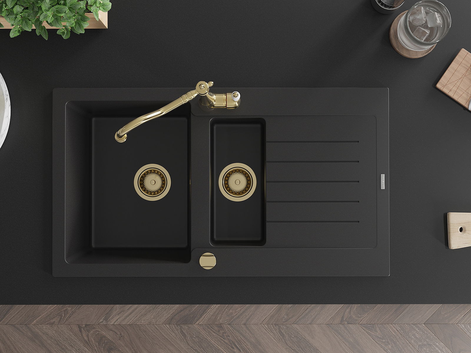 Mexen Matias granitový drez 1,5-komorový s odkvapkávacou plochou a kuchynskou batériou Carla, čierny - 6502-77-670700-50