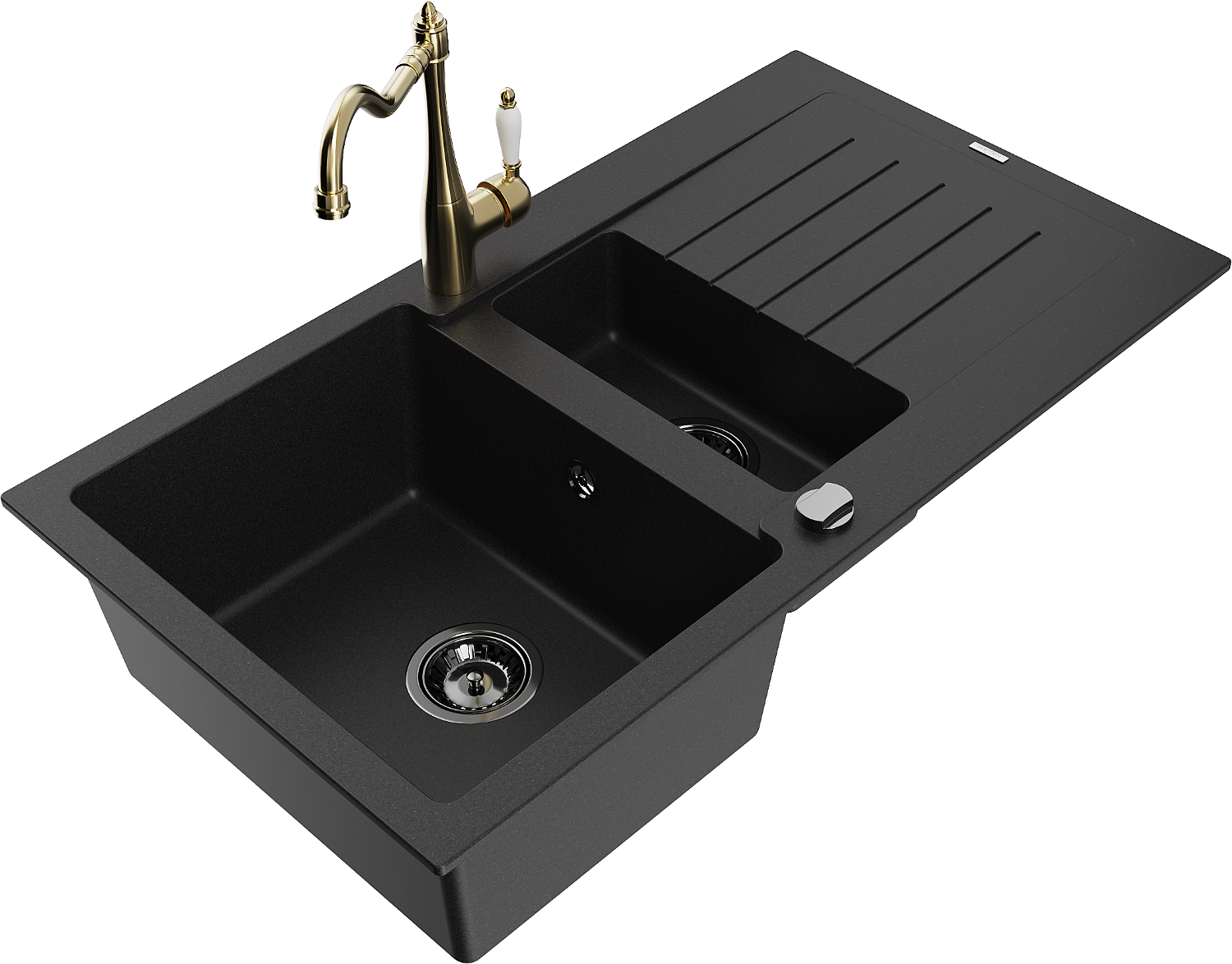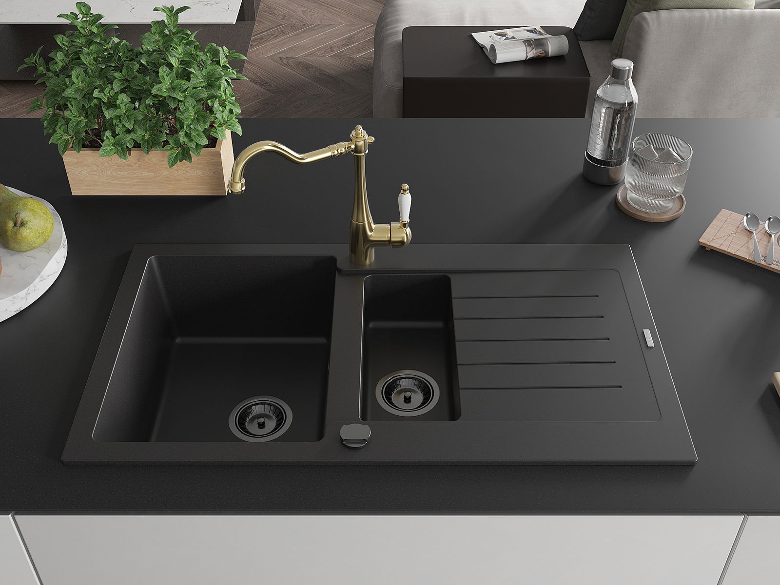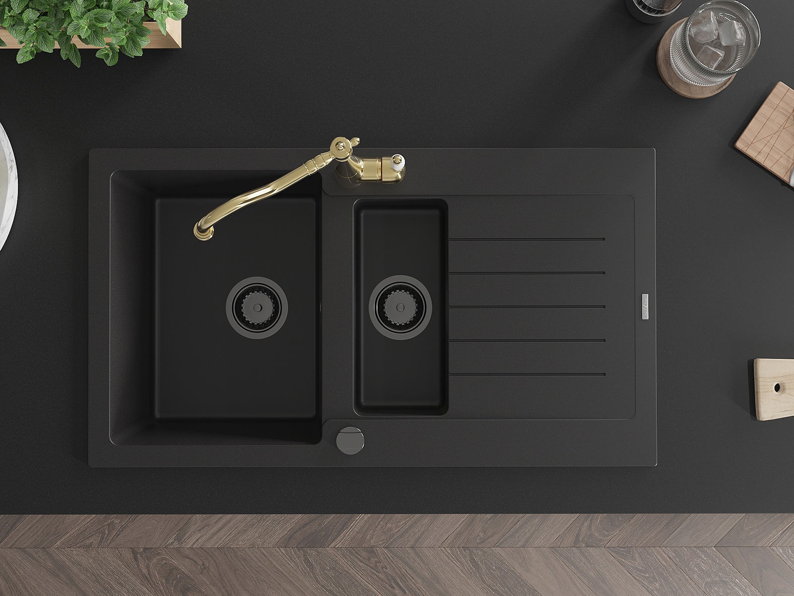 Mexen Matias žulový drez s 1,5 komorou s odkvapkávačom a kuchynskou batériou Carla, čierny - 6502-77-670700-50-B