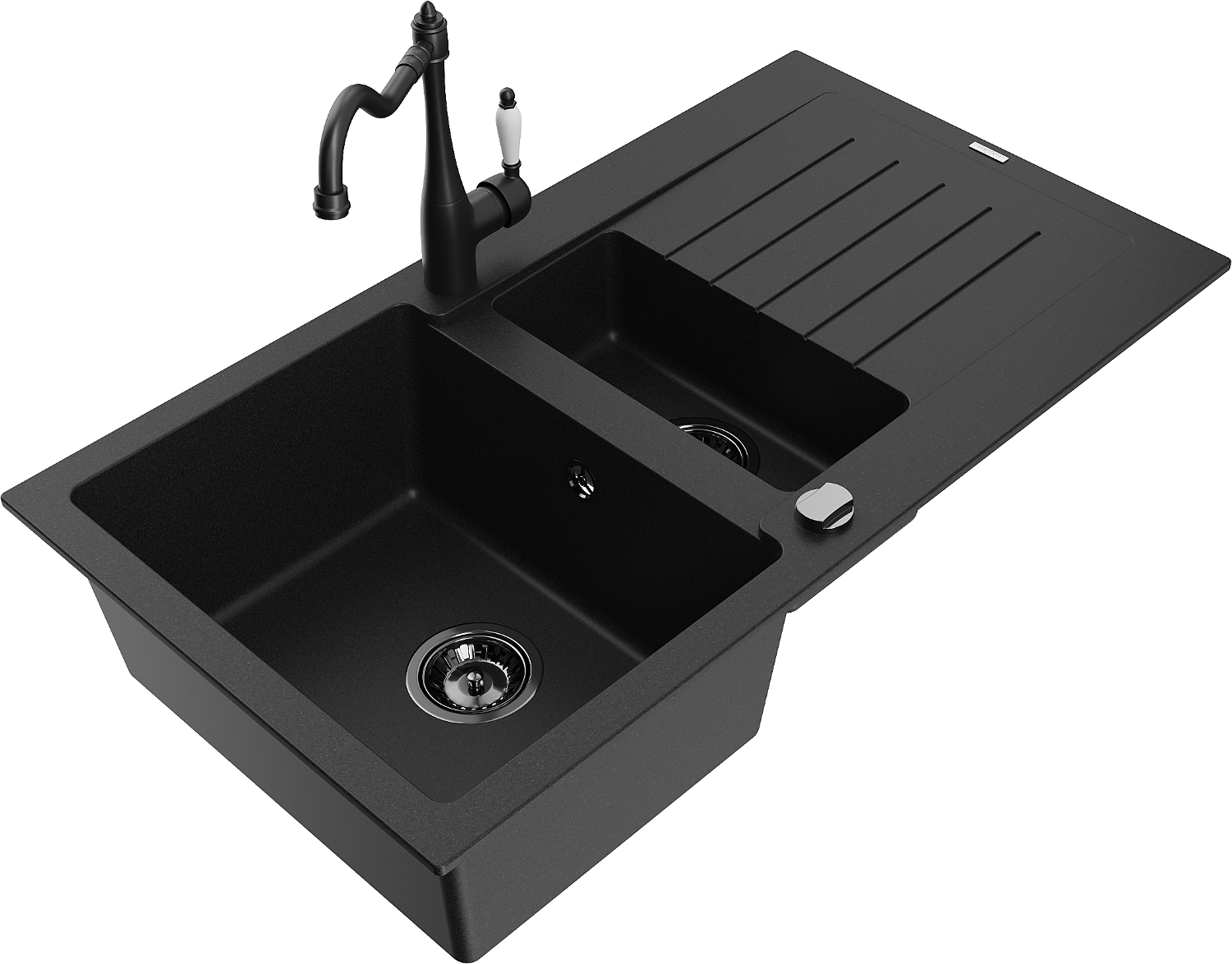 Mexen Matias granitový kuchynský drez 1,5-komorový s odkvapkávačom a kuchynskou batériou Carla, čierny - 6502-77-670700-70-B