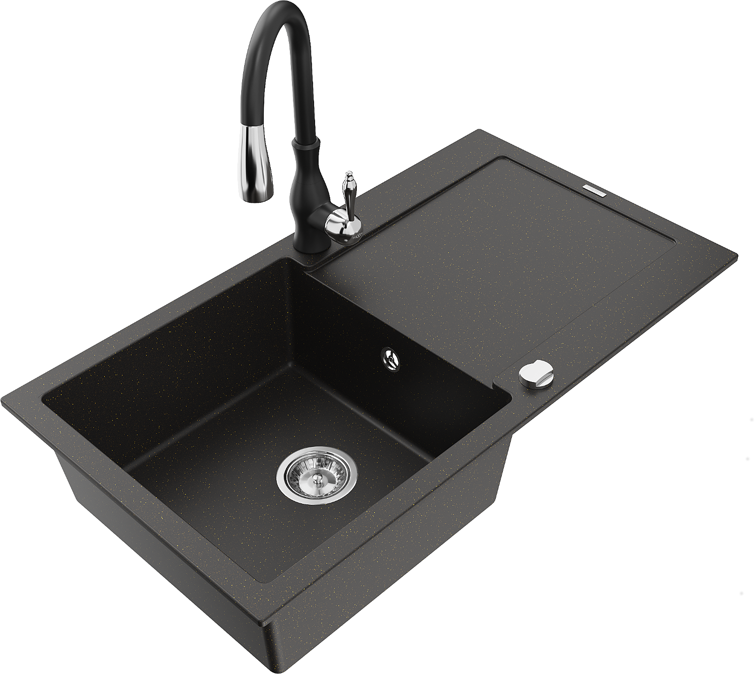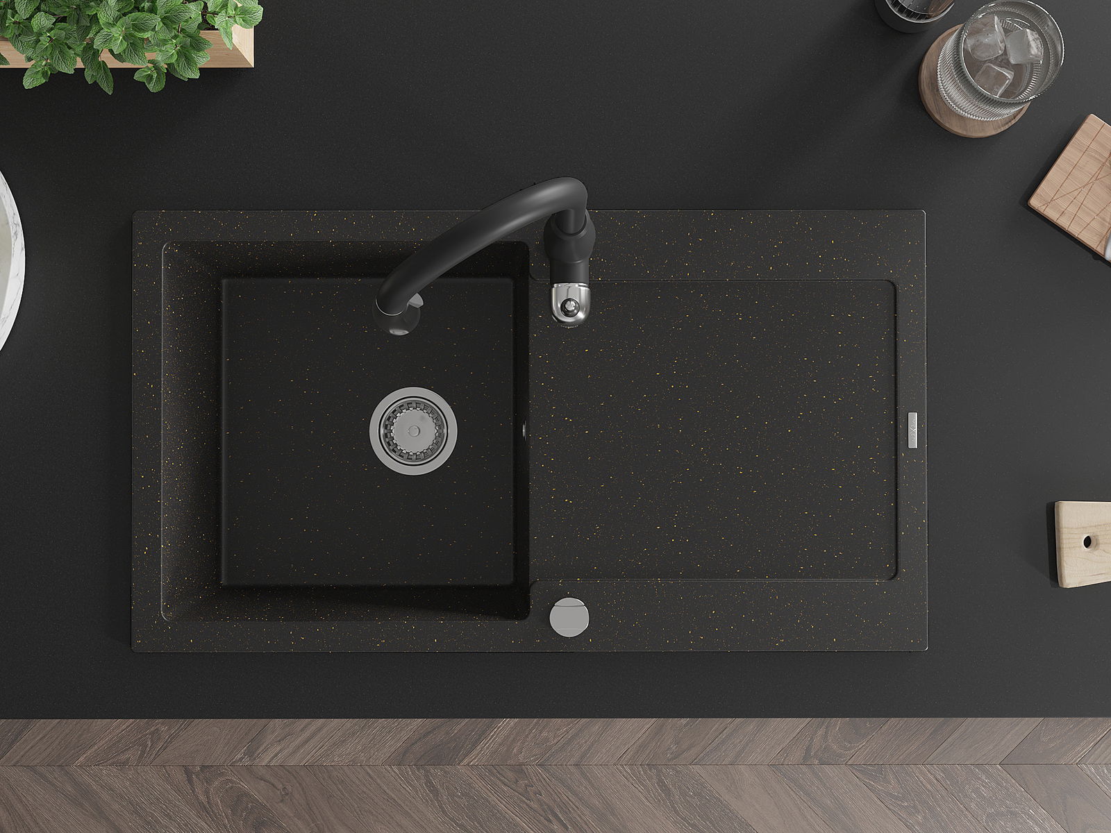 Mexen Leo granitový drez s jednou komorou s odkvapkávačom a kuchynskou batériou Savita, čierny/zlatý metalik