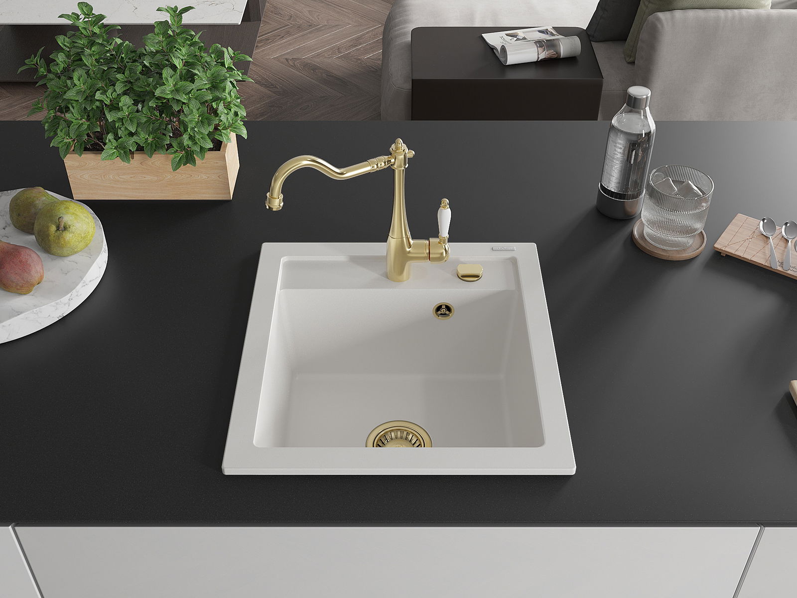Mexen Vito žulový kuchynský drez s 1 komorou a kuchynskou batériou Carla, biely - 6503-20-670700-50