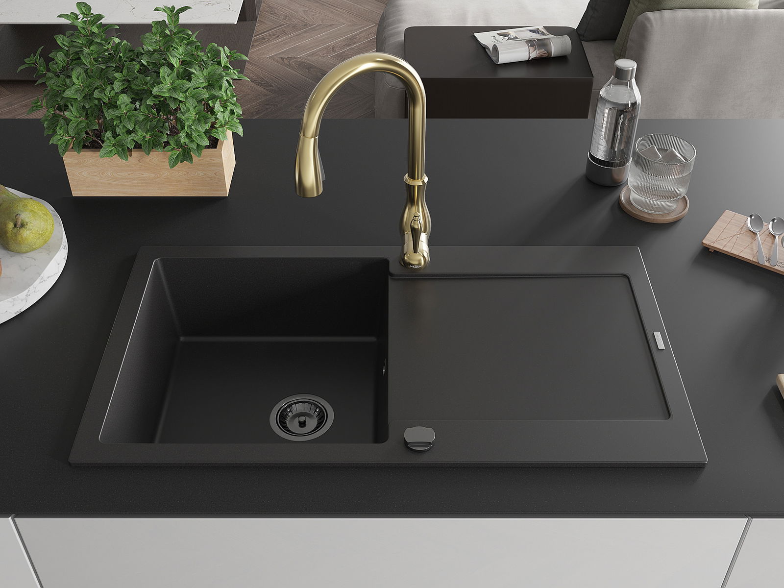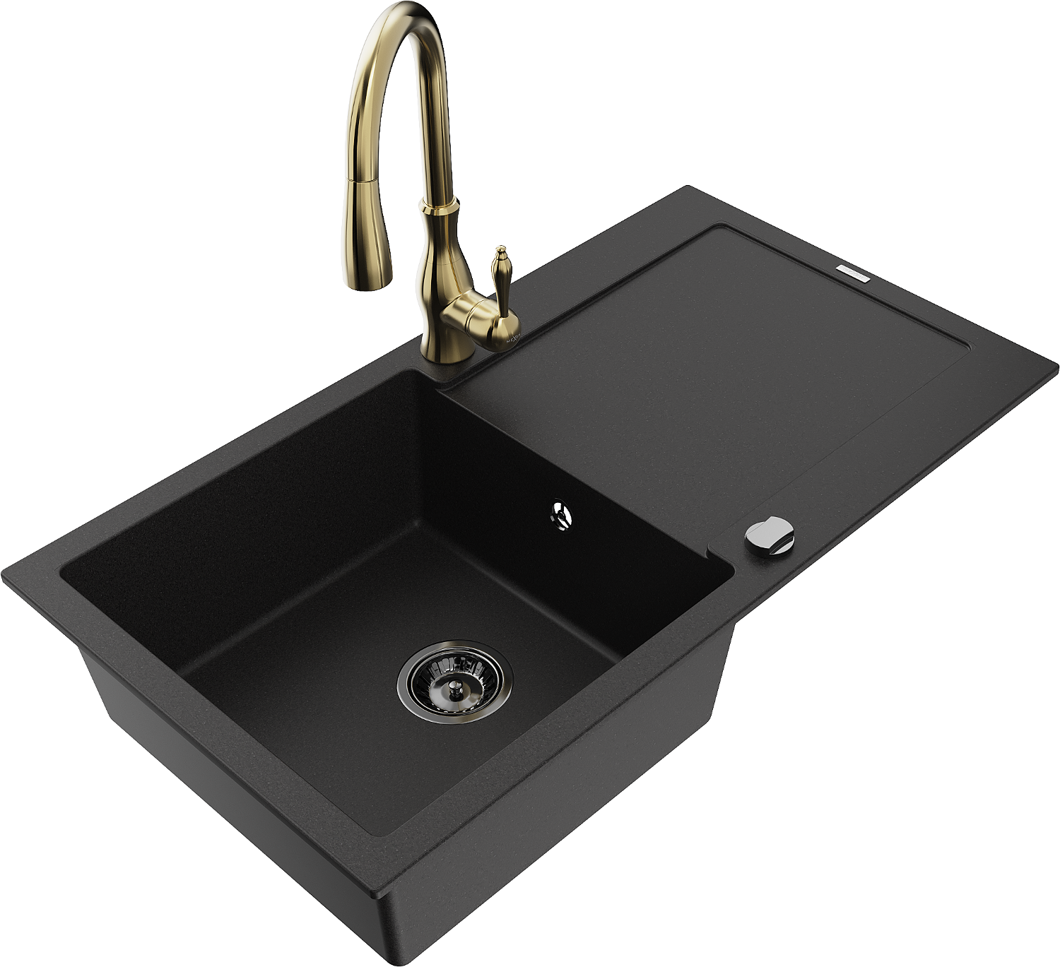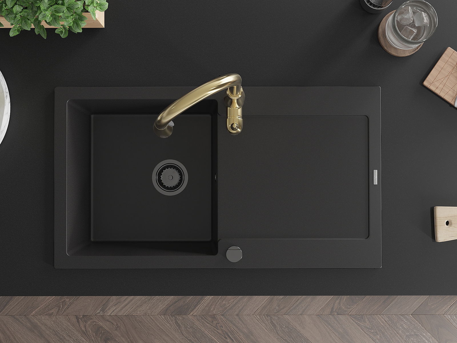 Mexen Leo granitový kuchynský drez 1-komorový s odkvapkávačom a kuchynskou batériou Savita, čierny - 6501-77-672601-50-B