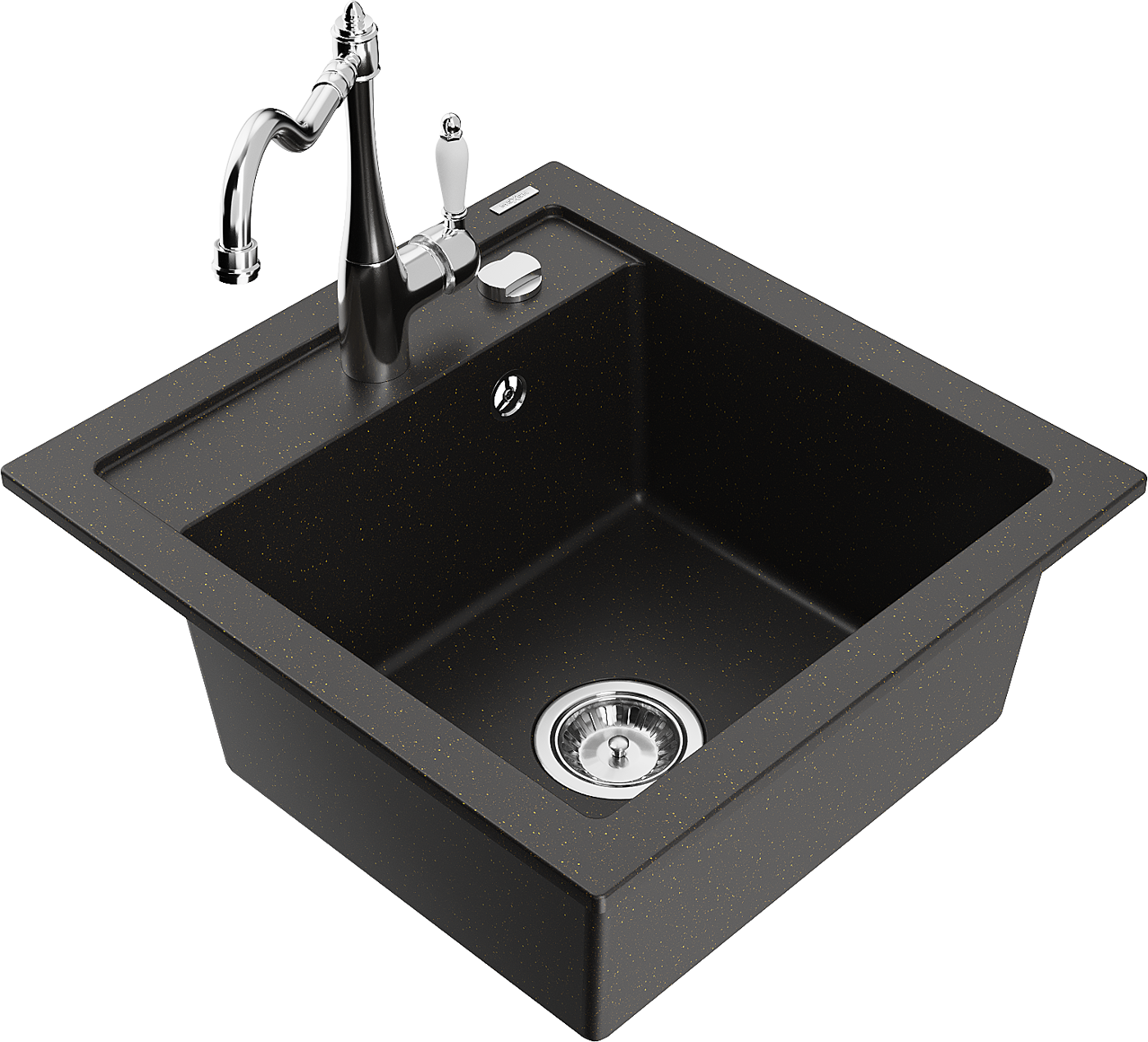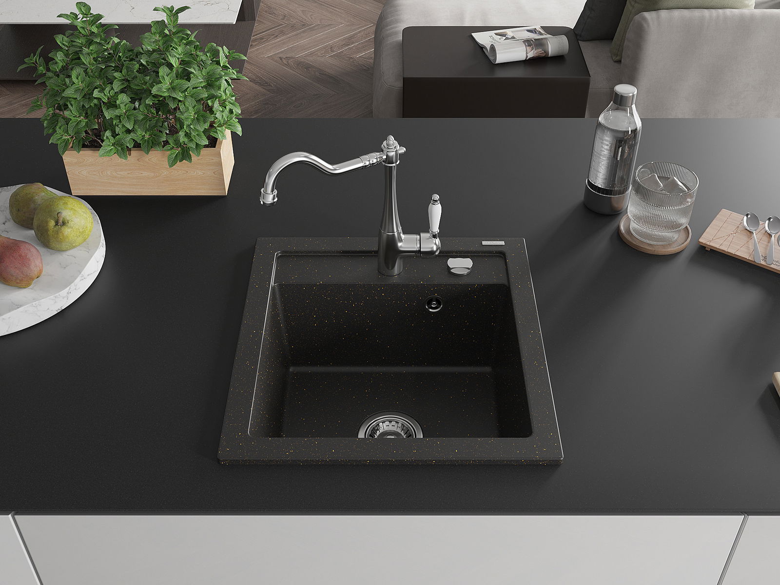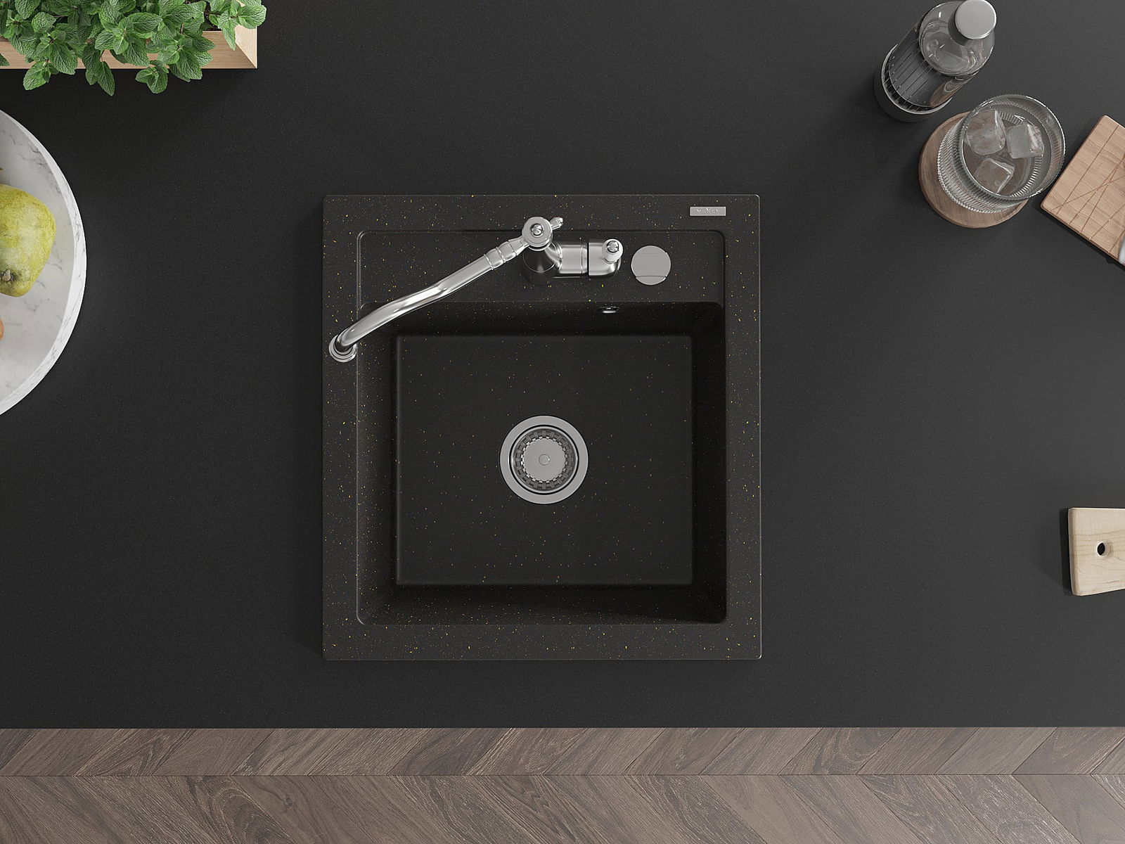 Mexen Vito granitový drez s 1 komorou a kuchynskou batériou Carla, čierny/zlatý metalík - 6503-75-670700-00