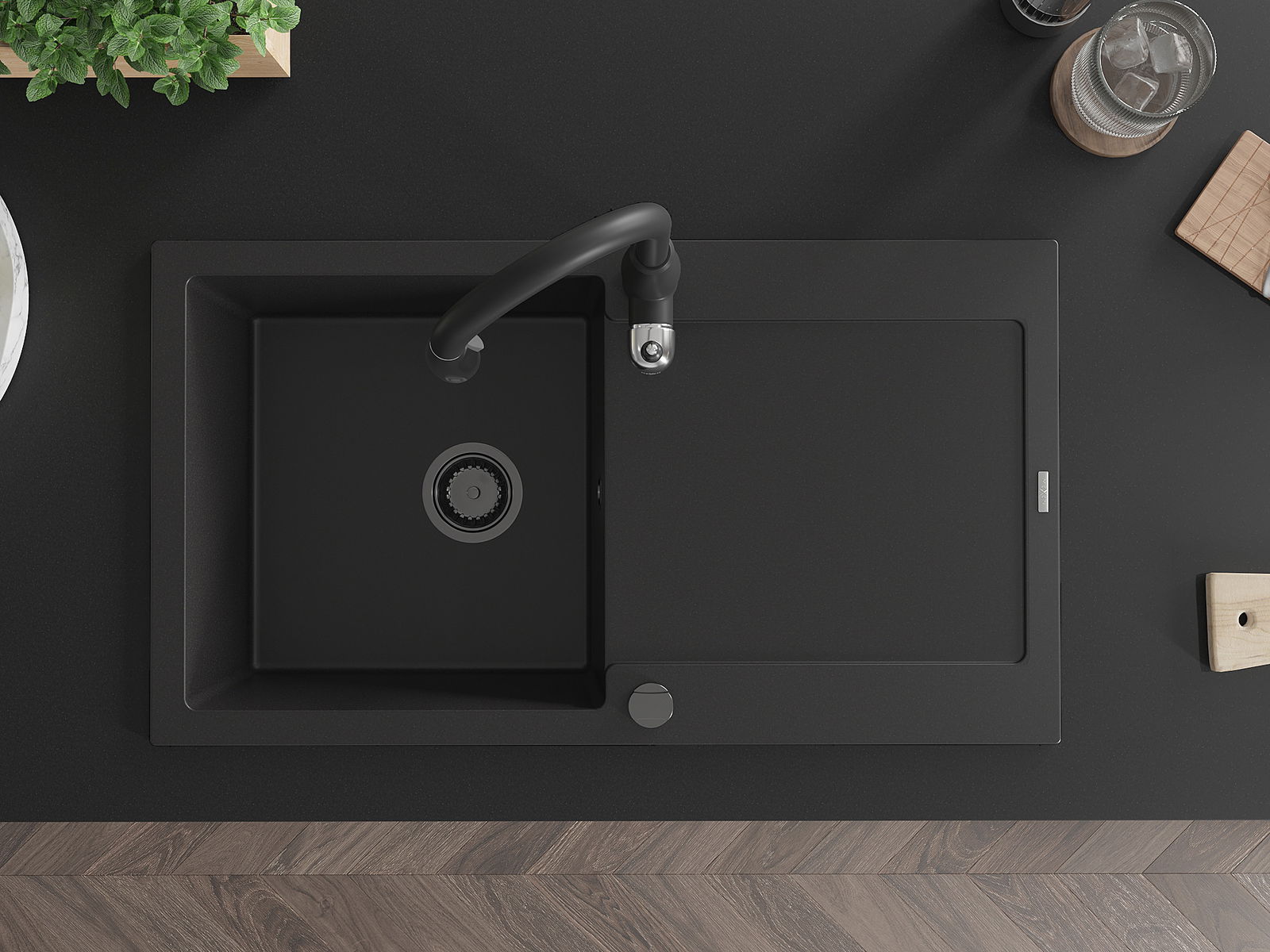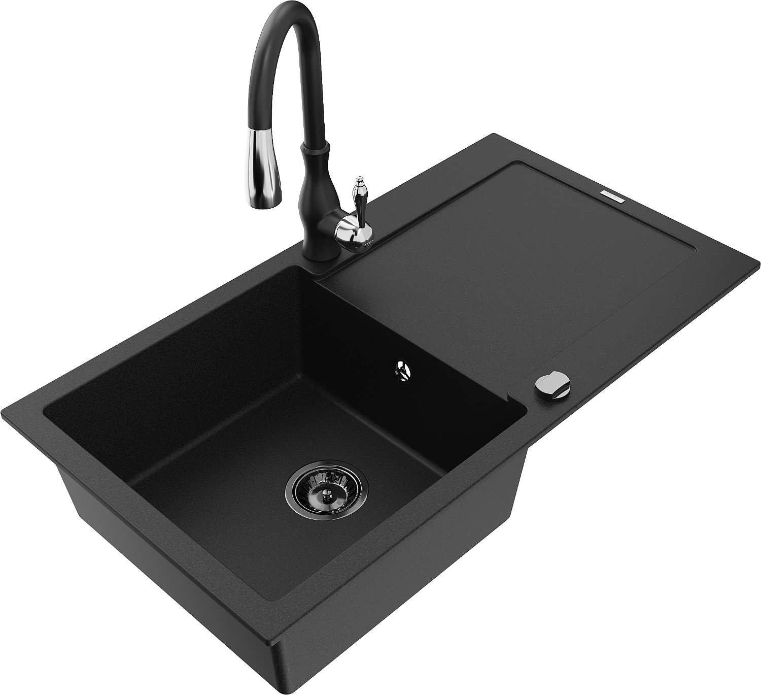 Mexen Leo granitový kuchynský drez s 1 komorou, odkvapávačom a kuchynskou batériou Savita, čierny - 6501-77-672601-70-B