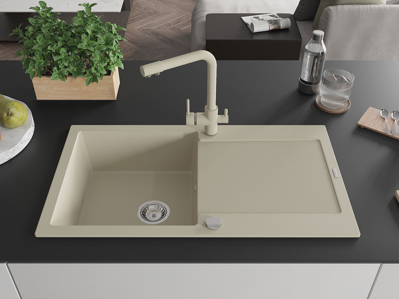 Povrch umývadla je odolný voči škvrnám a sfarbeniu, vďaka čomu sa ľahko čistí a zachováva si svoju farbu po dlhú dobu. Estetický a prakticky dopĺňajúci každú kuchyňu.