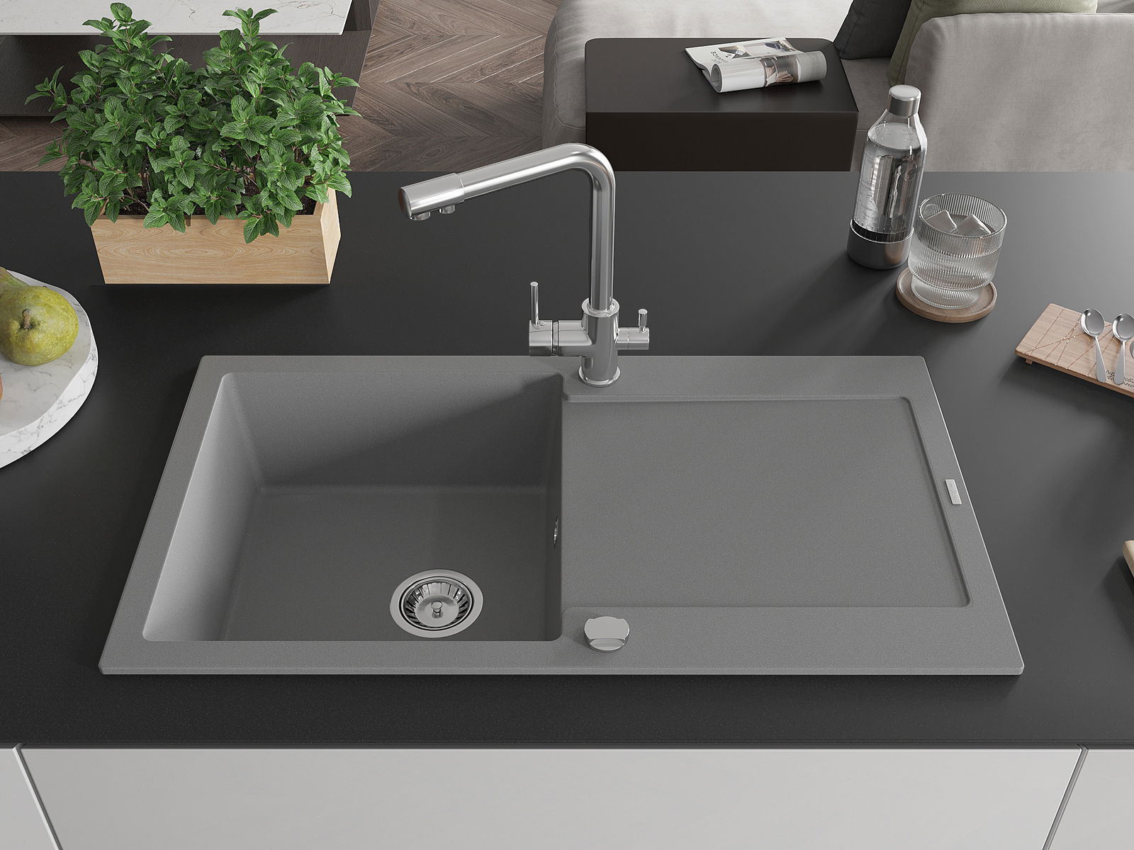 Mexen Leo žulový drez s 1 komorou a odkvapkávačom a kuchynskou batériou Duero, sivý - 6501-71-671600-00