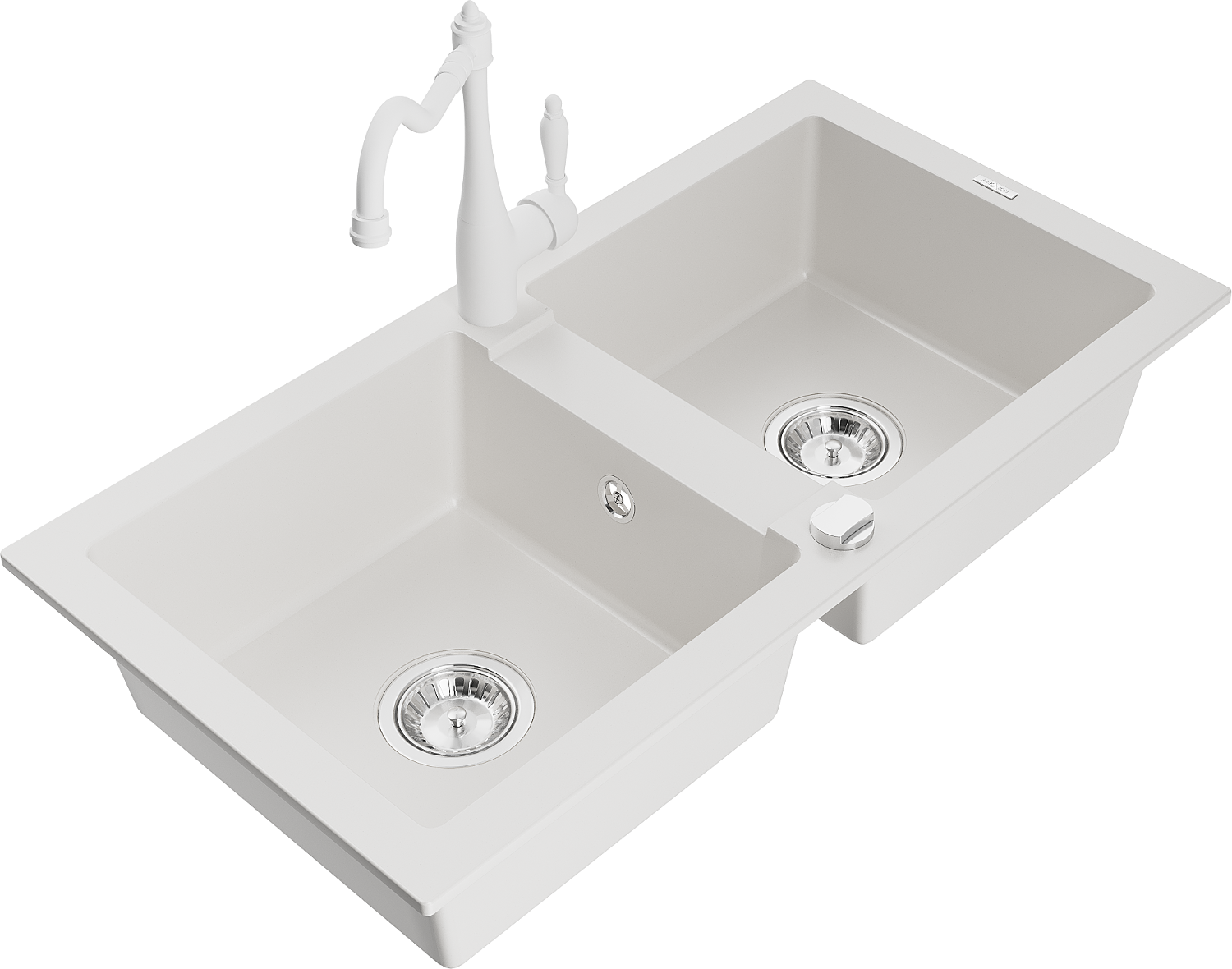 Mexen Mario dvojkomorový žulový drez s kuchynskou batériou Carla, biely - 6504-20-670700-20