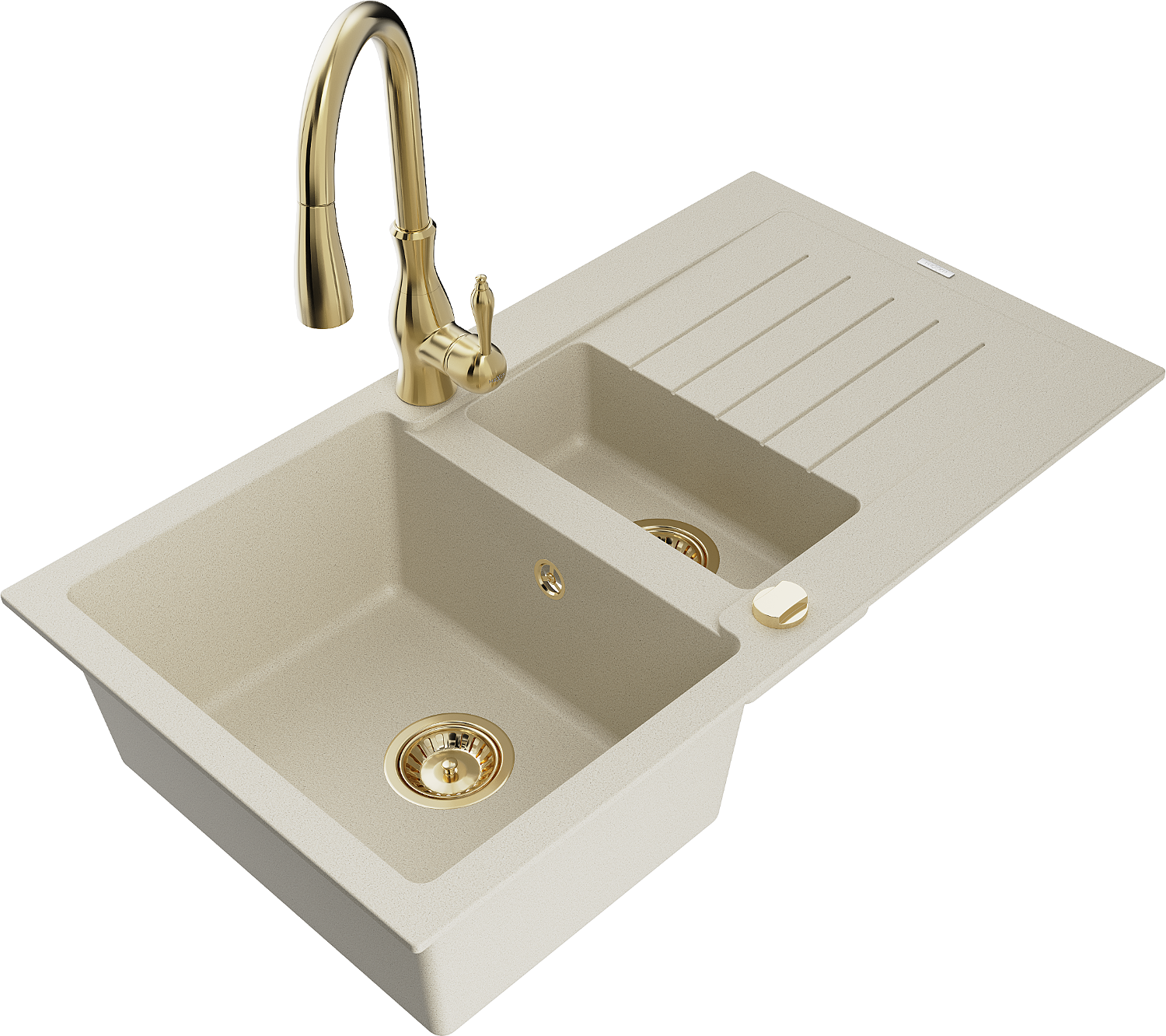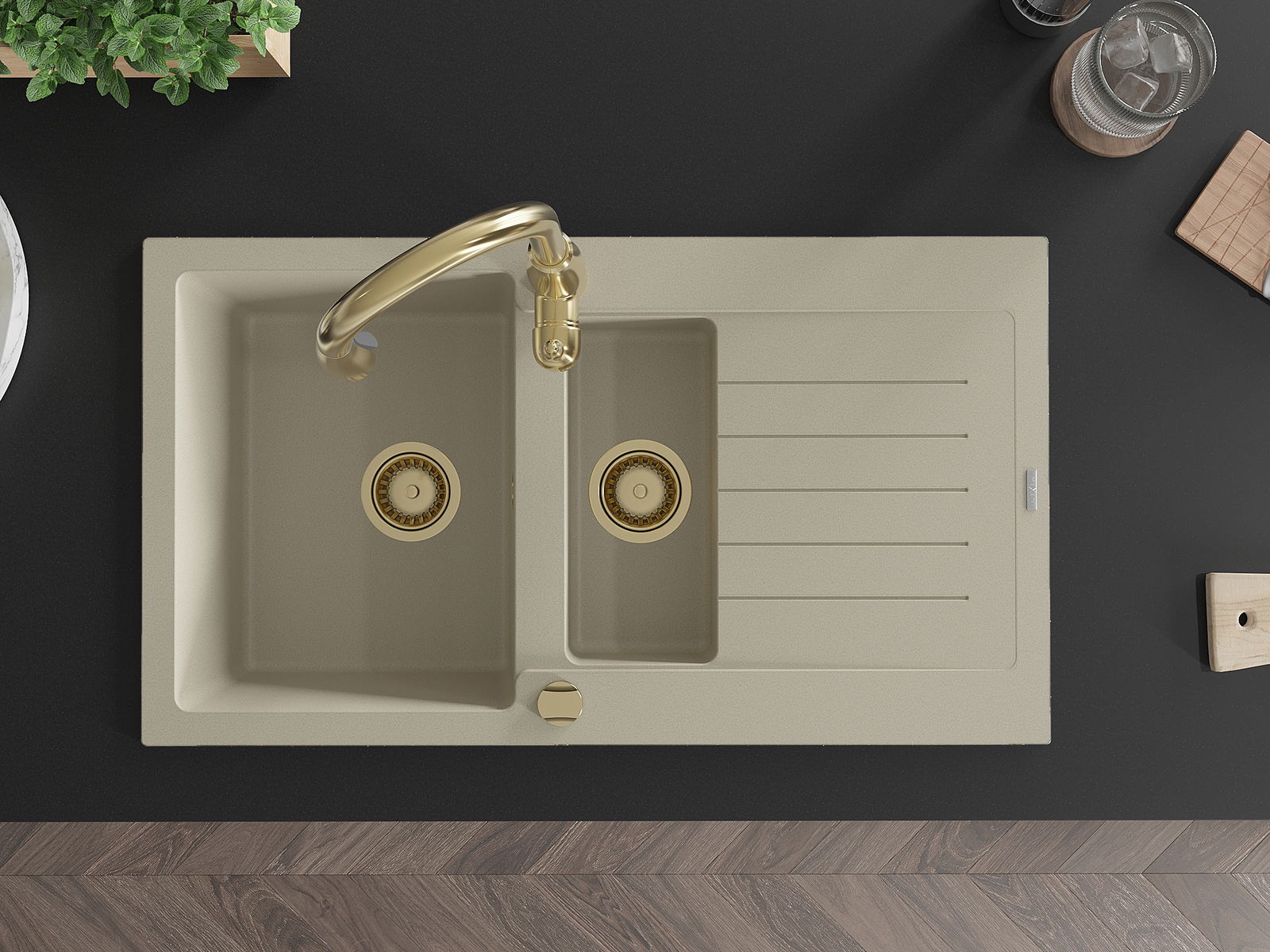 Mexen Matias žulový drez 1,5-komorový s odkvapkávačom a kuchynskou batériou Savita, béžový - 6502-69-672601-50