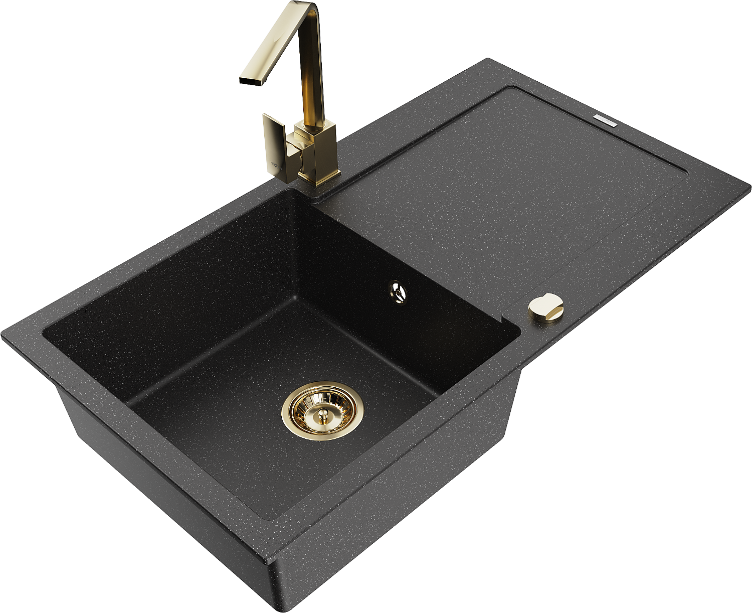 Mexen Leo granitový jednokomorový kuchynský drez s odkvapkávacou plochou a kuchynskou batériou Rita, čierno/strieborná