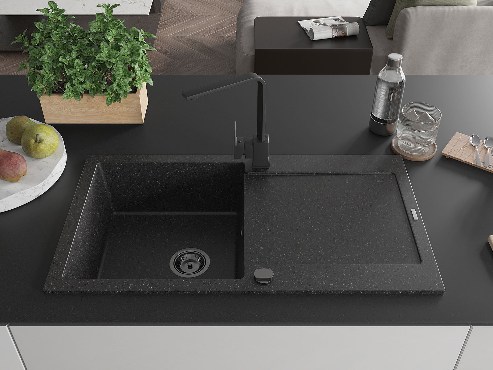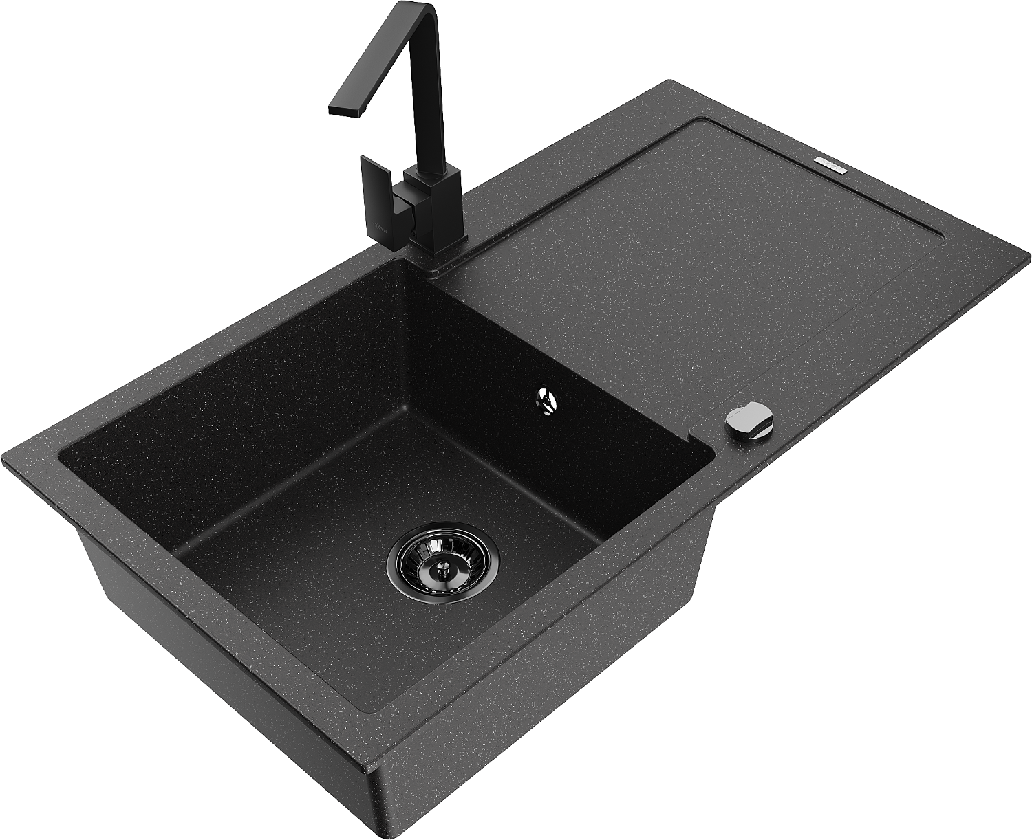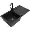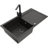Mexen Leo granitový drez s jednou komorou s odkvapkávačom a kuchynskou batériou Rita, čierny/strieborný metalický