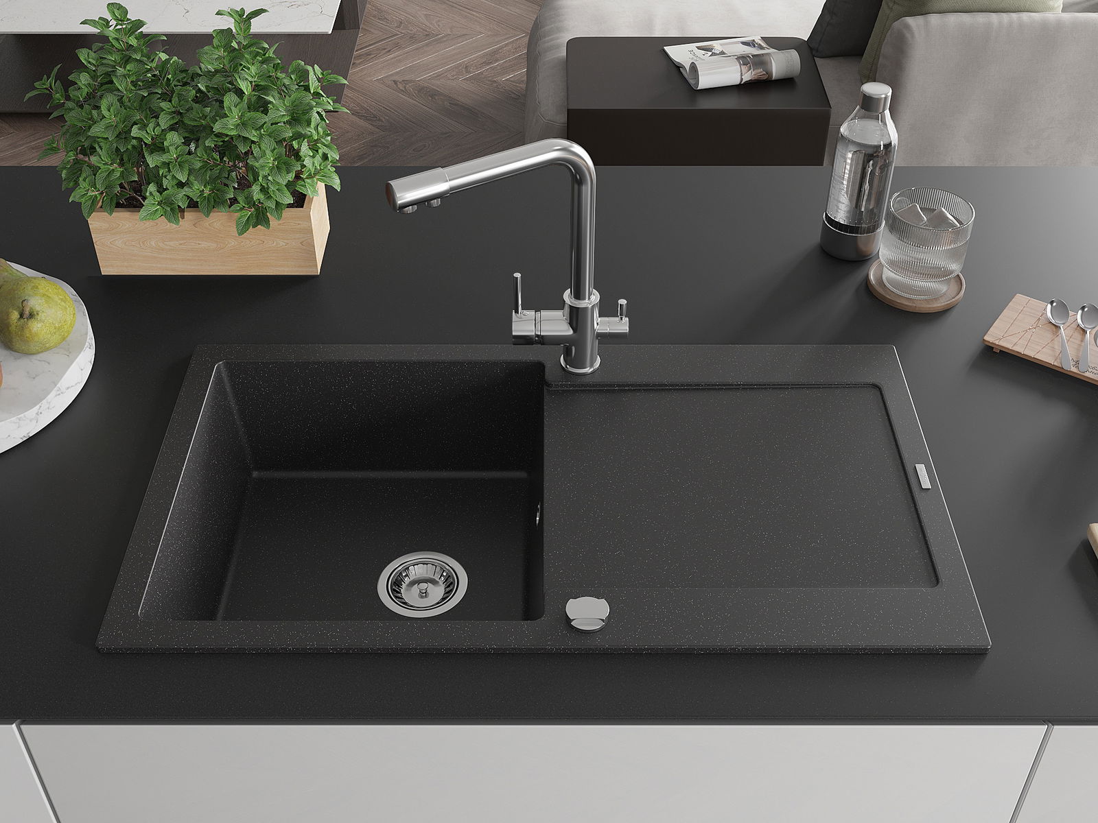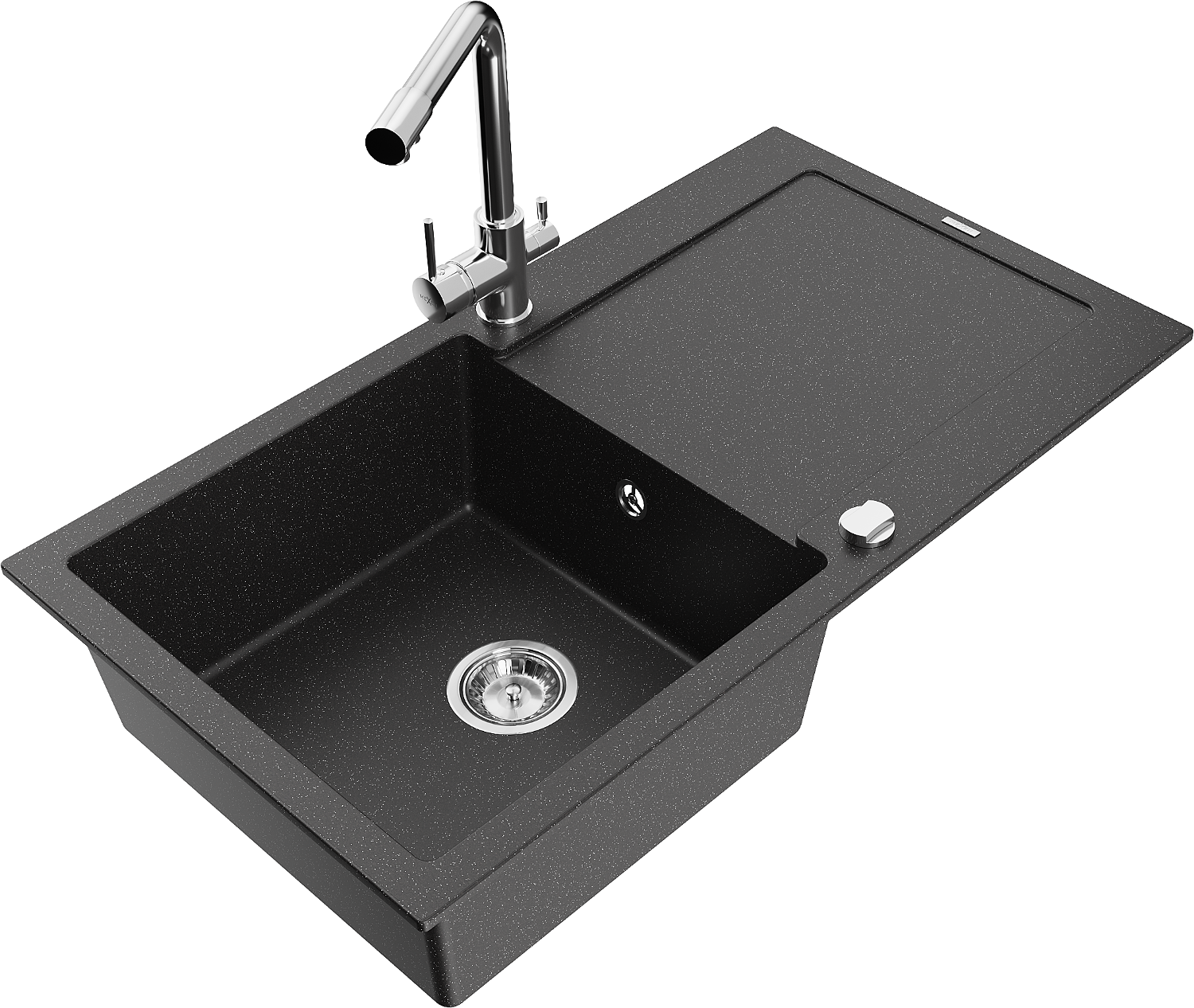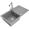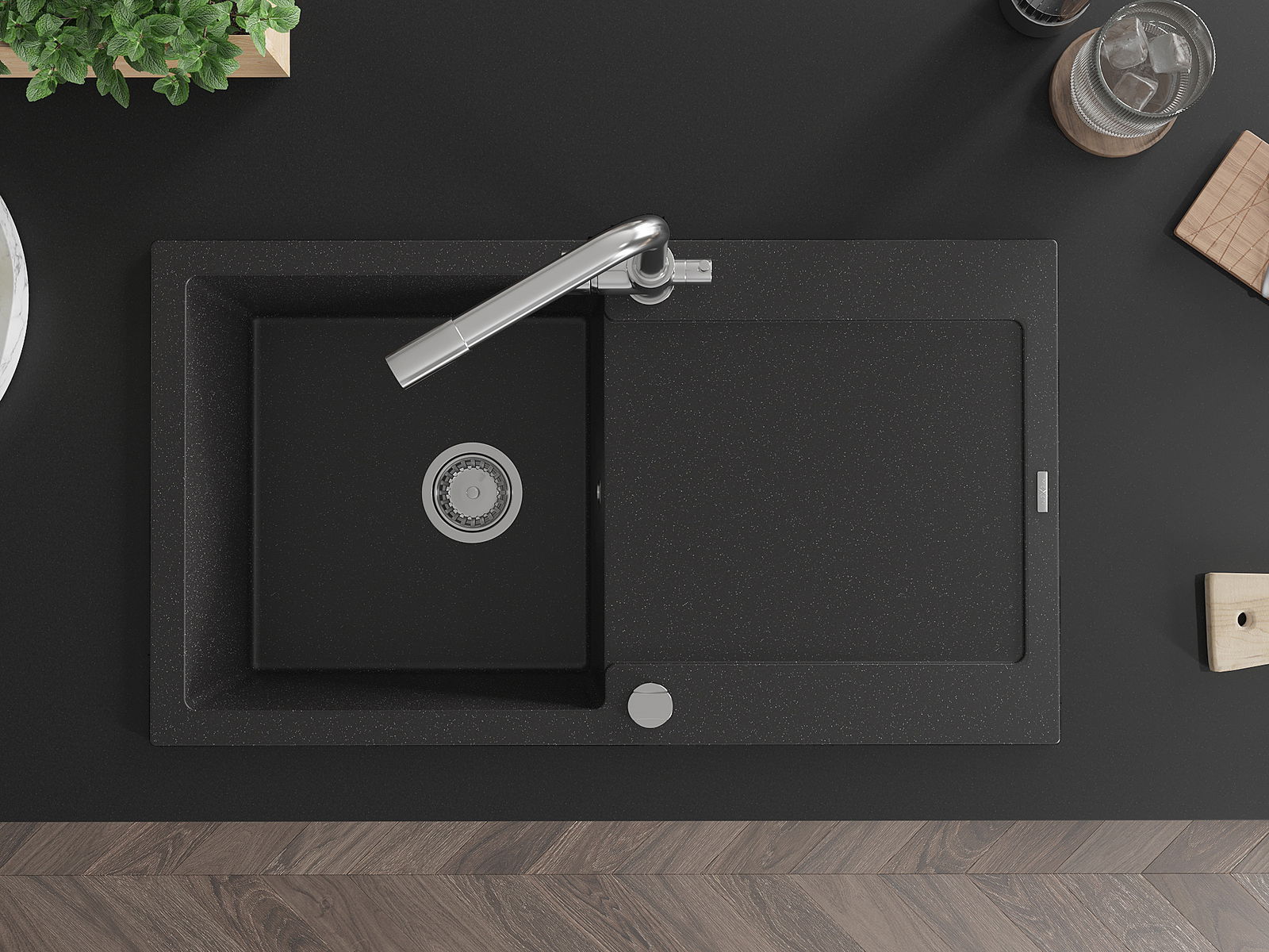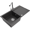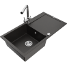 Mexen Leo granitový drez 1-komorový s odkvapkávačom a kuchynskou batériou Duero, čierny/strieborný metalik - 6501-73-671600-00