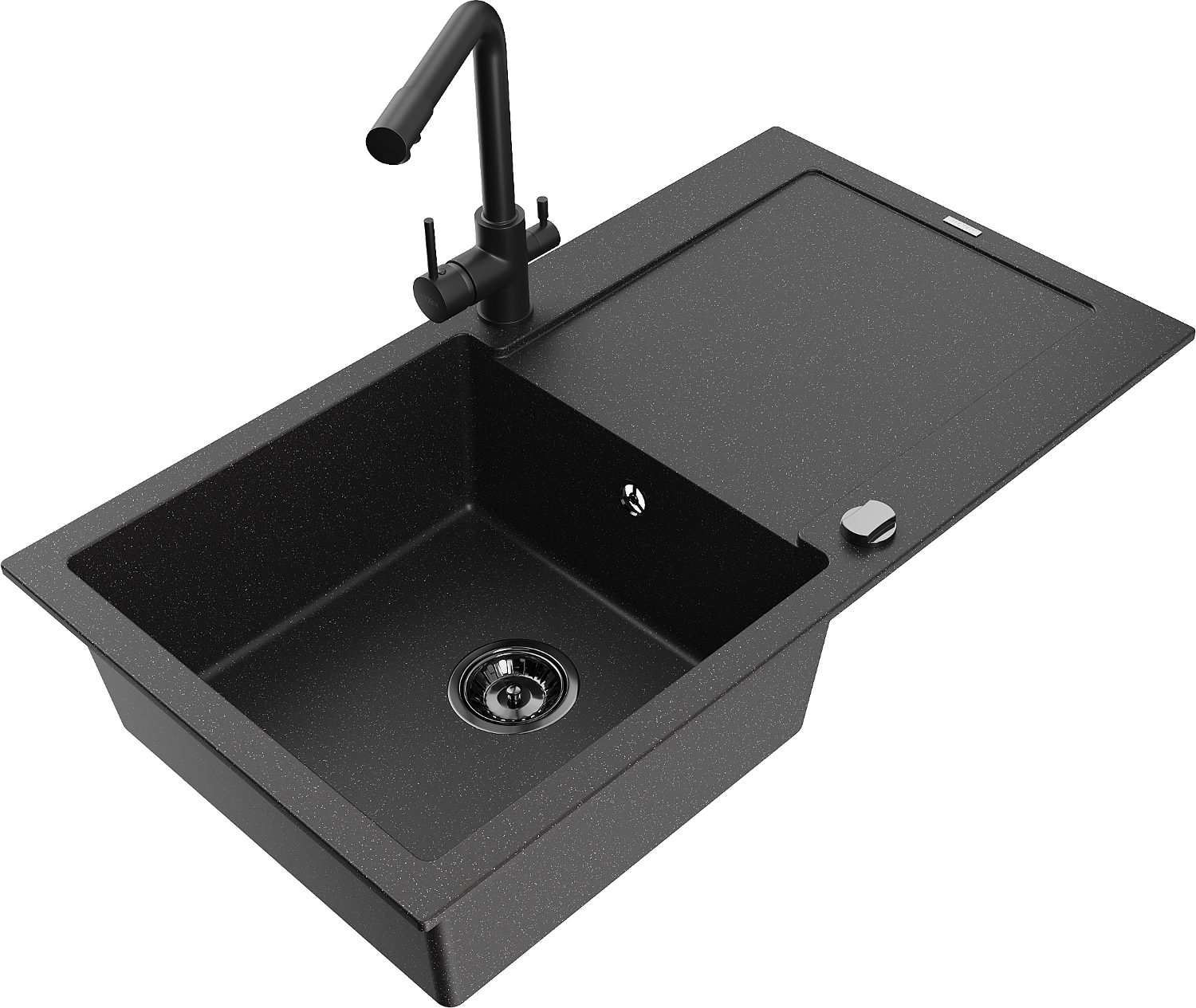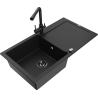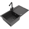 Mexen Leo jednokomorový žulový drez s odkvapkávačom a kuchynskou batériou Duero, čierny/strieborný metalík