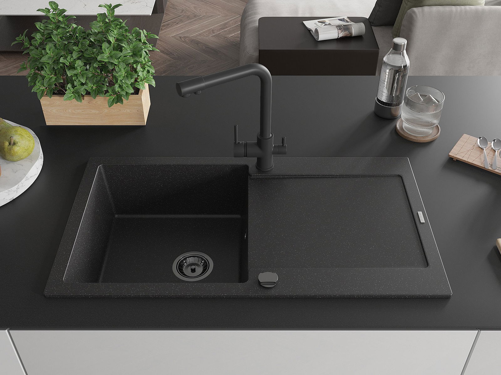 Drez bol vyrobený z vysoko kvalitného granitu. Predstavuje elegantné, ale predovšetkým praktické doplnenie každej kuchyne, nezávisle od jej štýlu. Vysoká kvalita a trvácnosť granitu zaisťujú dlhodobé používanie.