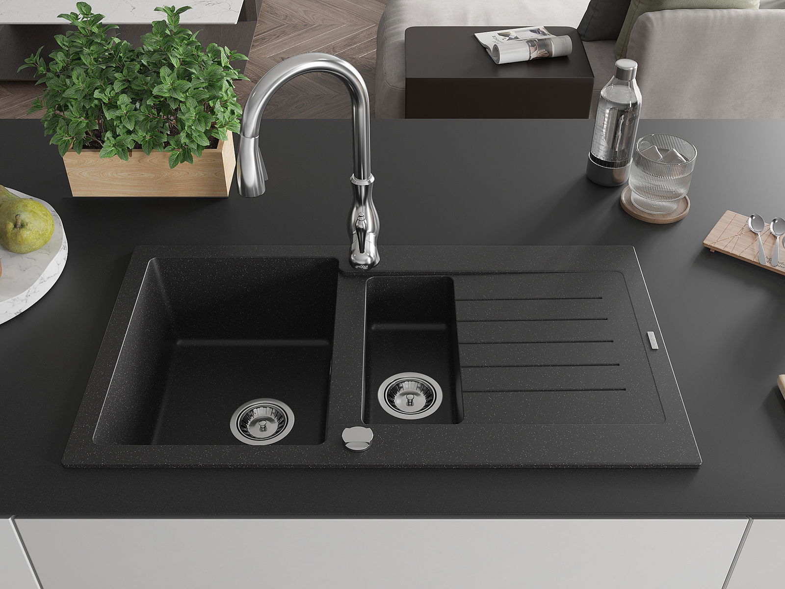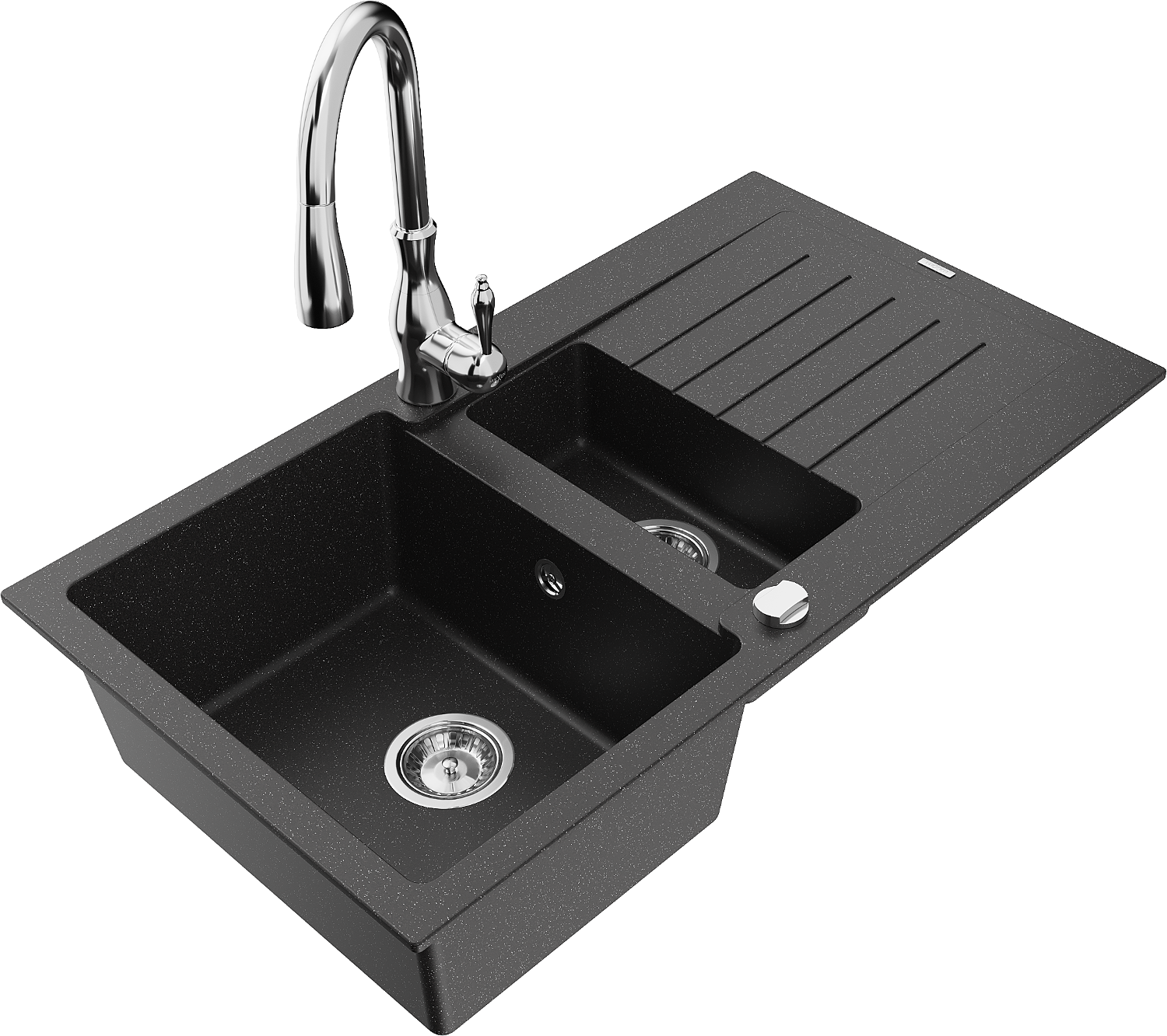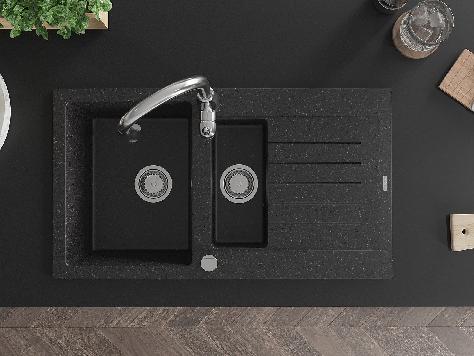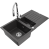 Mexen Matias granitový drez 1,5-komorový s odkvapkávačom a kuchynskou batériou Savita, čierny/strieborný