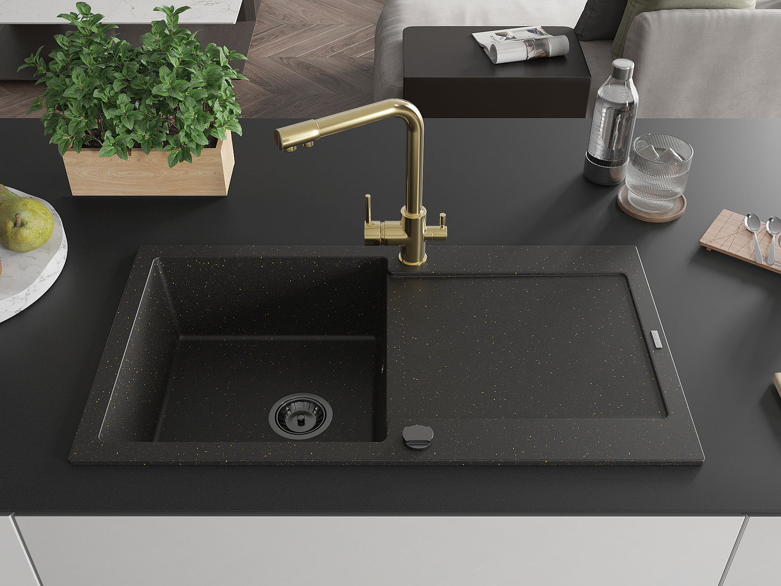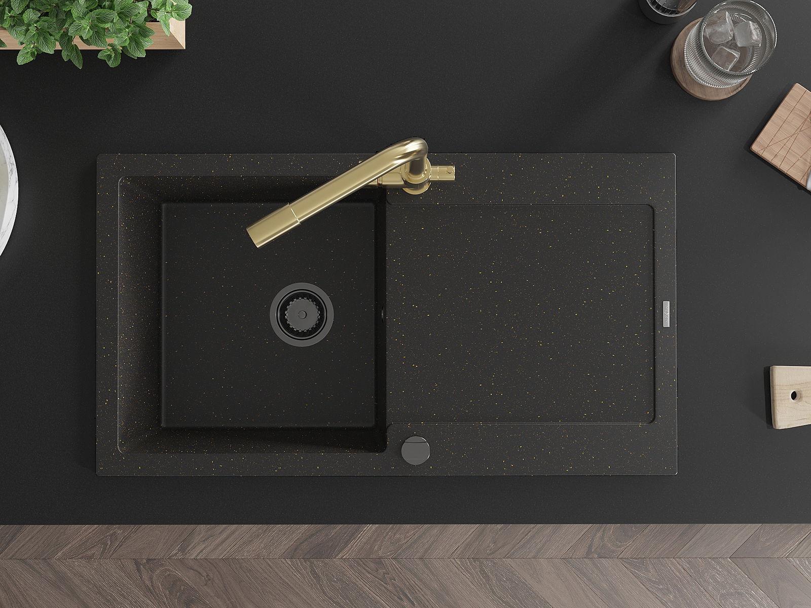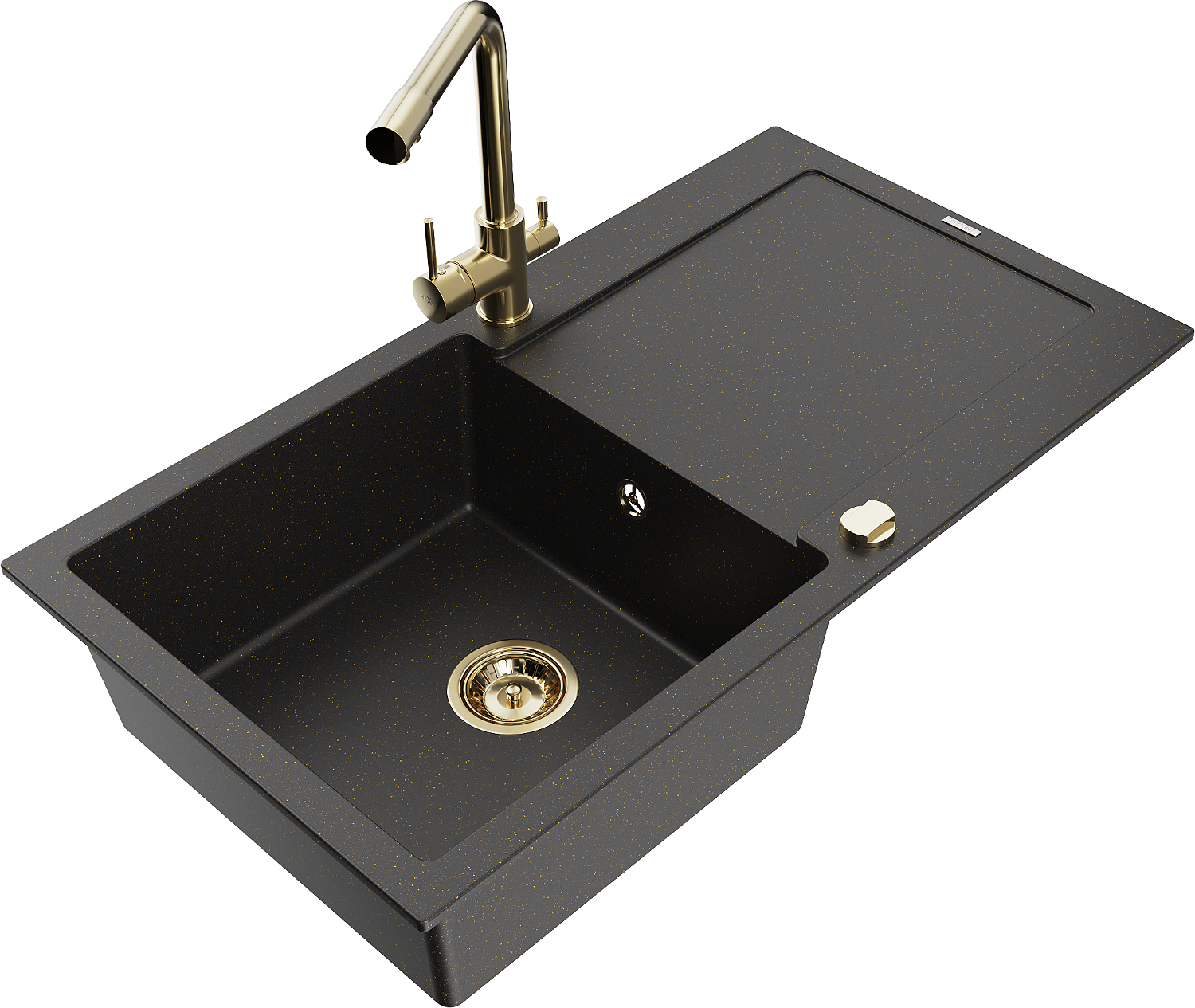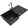 Mexen Leo jednovaničkový granitový drez s odkvapkávačom a kuchynskou batériou Duero, čierny/zlatý metalik - 6501-75-671600-50-B