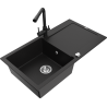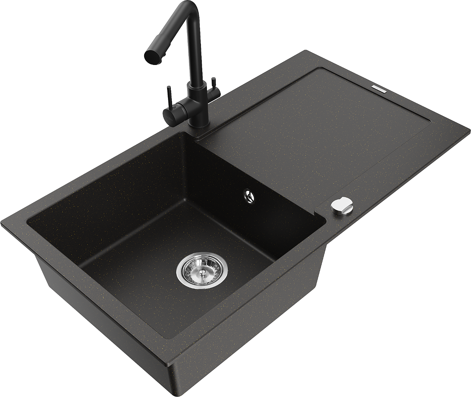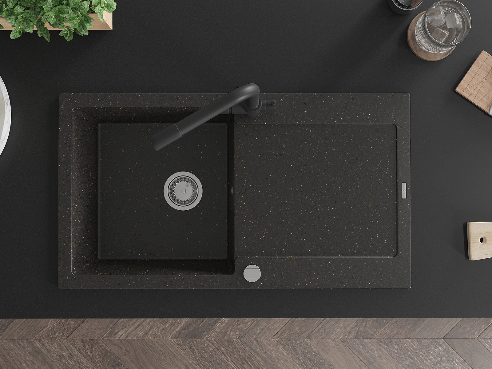 Mexen Leo granitový kuchynský drez s jednou komorou a odkvapkávačom a kuchynskou batériou Duero, čierny/zlatý metalik