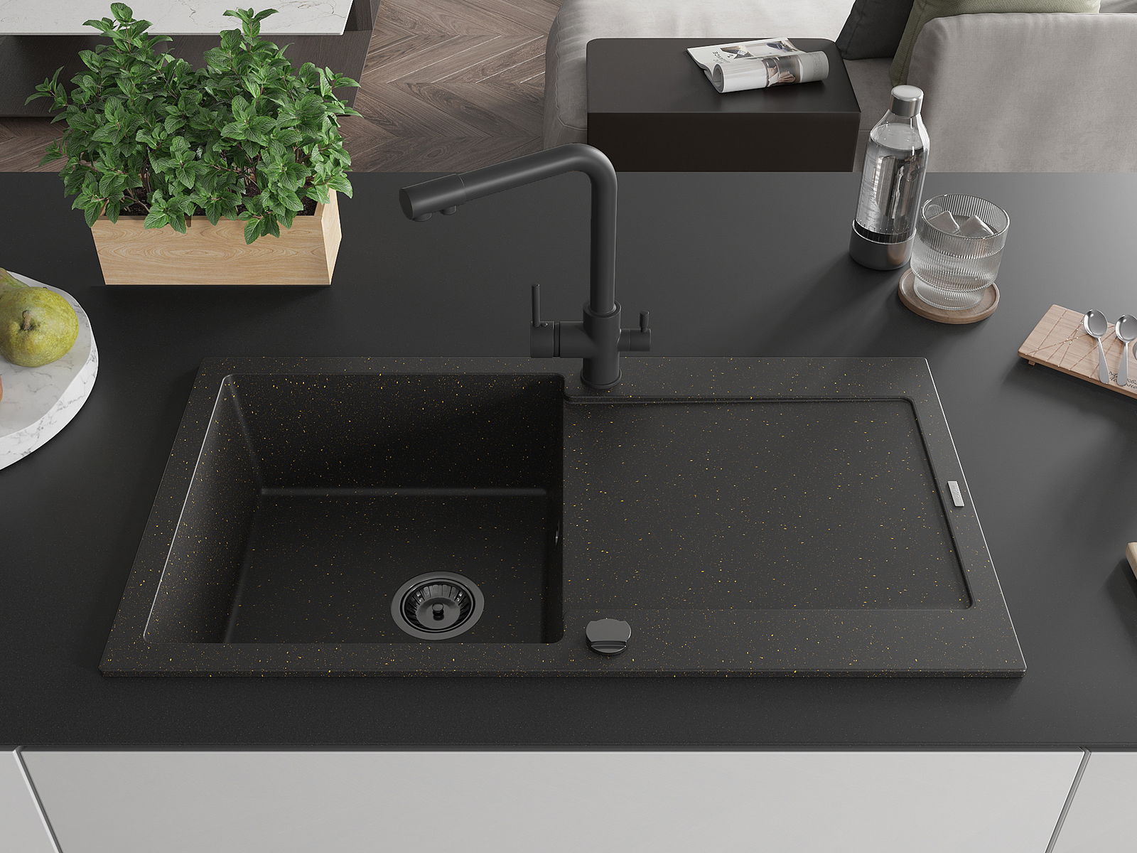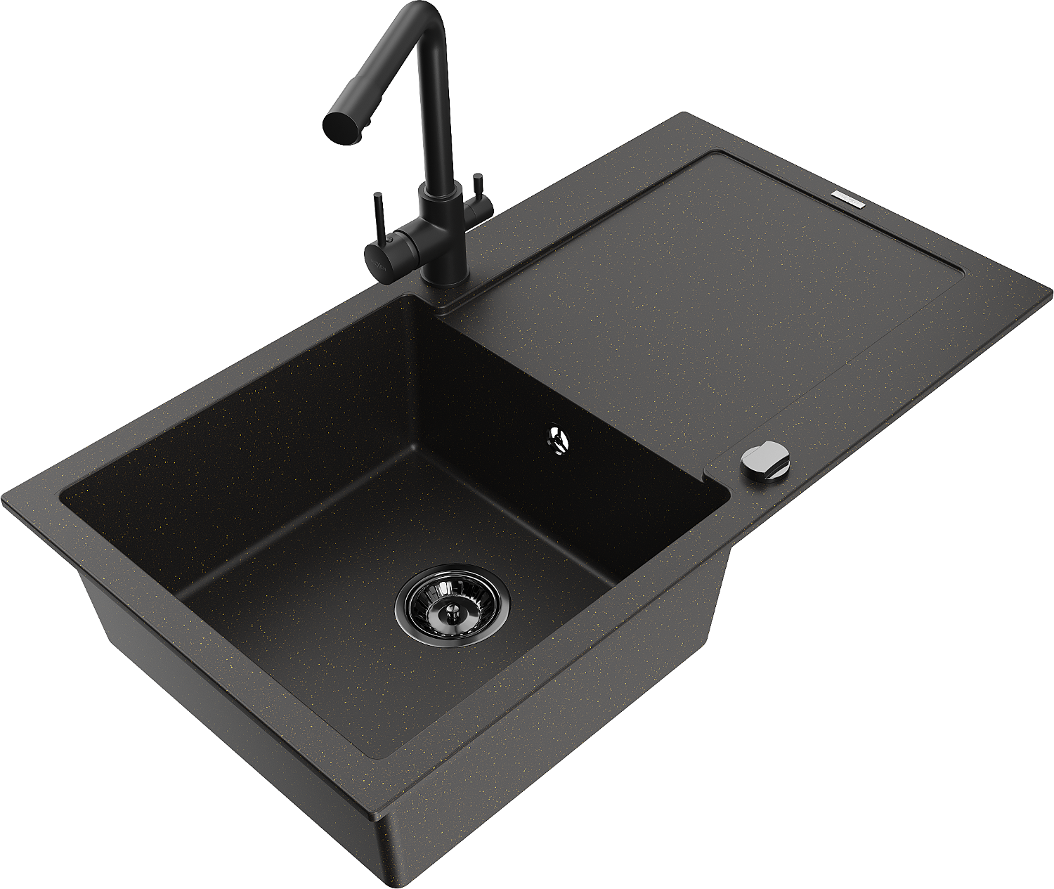 Mexen Leo granitový kuchynský drez s 1 komorou, odkvapkávacou plochou a kuchynskou batériou Duero, čierny/zlatý metalik