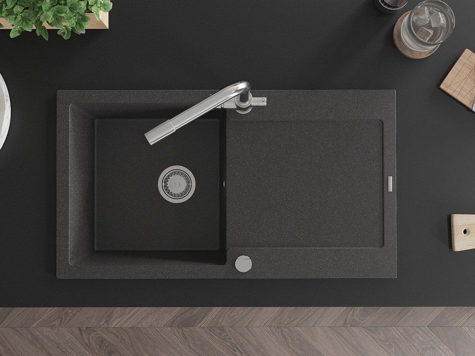Povrch kuchynského drezu je odolný voči škvrnám a zafarbeniu, vďaka čomu sa ľahko udržiava a zachováva svoju farbu počas dlhého obdobia používania. Estetický a praktický doplnok pre každú kuchyňu.