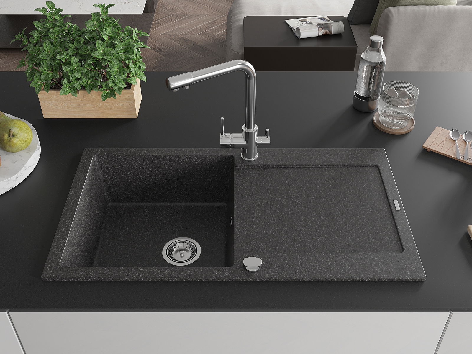 Drez bol vyrobený z vysoko kvalitného granitu. Predstavuje elegantné, ale predovšetkým praktické doplnenie každej kuchyne, nezávisle od jej štýlu. Vysoká kvalita a trvácnosť granitu zaisťujú dlhodobé používanie.