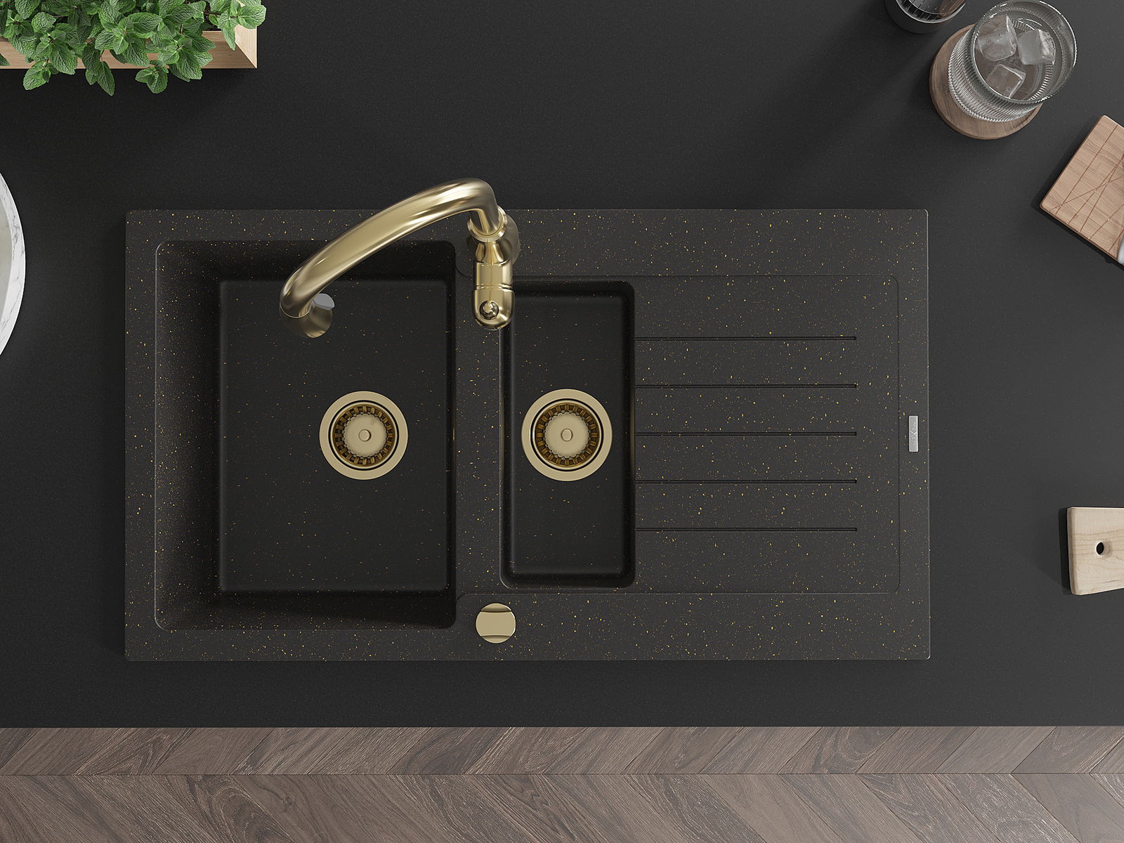 Mexen Matias granitový drez 1,5-komorový s odkvapkávačom a kuchynskou batériou Savita, čierny/zlatý - 6502-75-672601-50