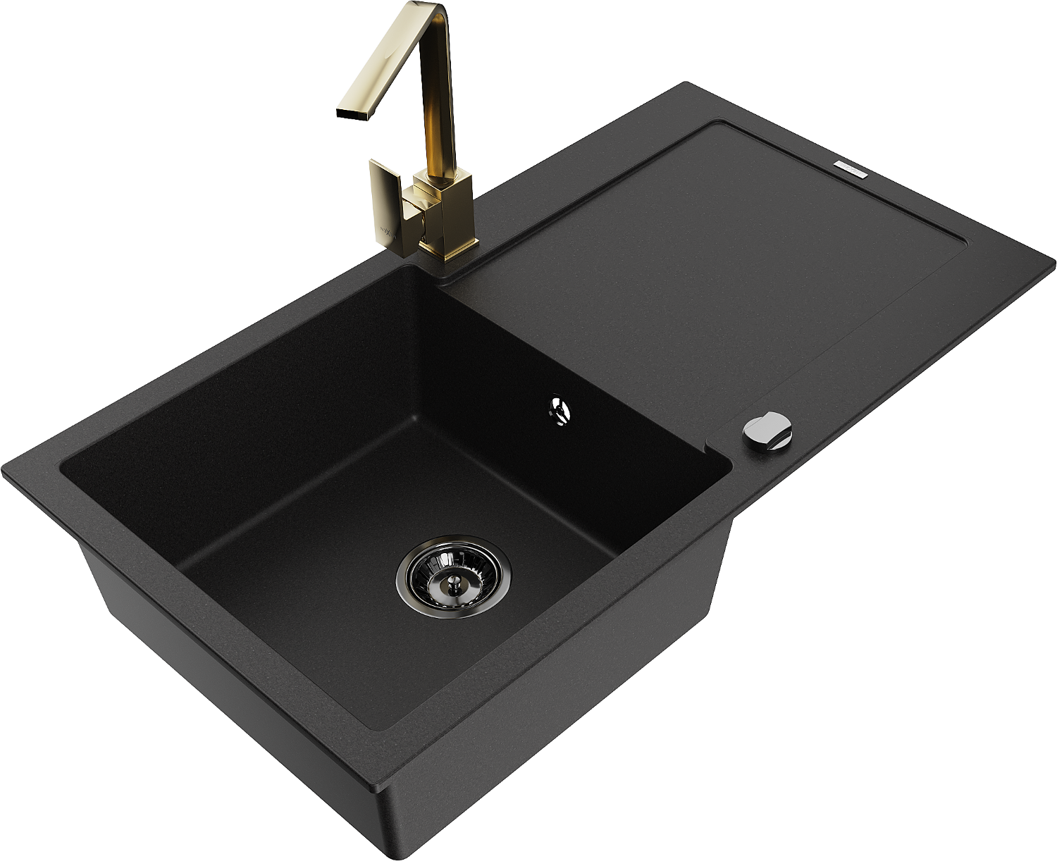 Mexen Leo granitový umývadlo 1-komorové s odkvapkávacou plochou a kuchynskou batériou Rita, čierna - 6501-77-670300-50-B