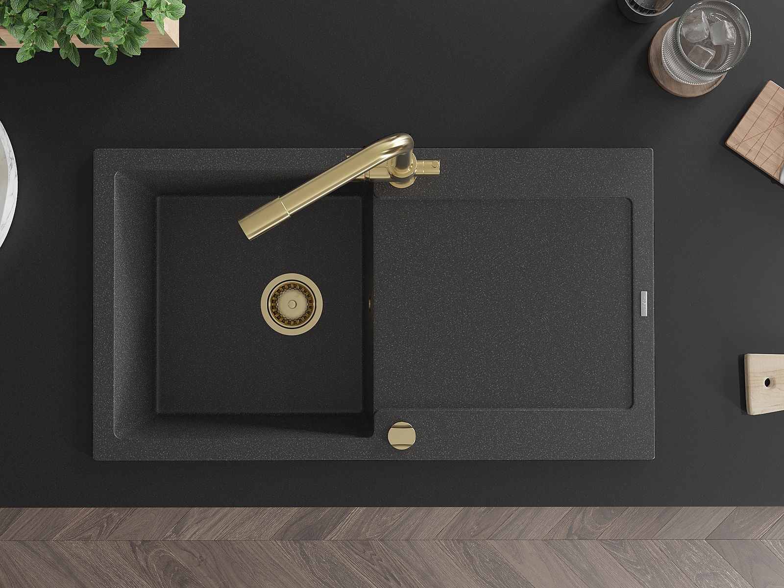 Mexen Leo granitový drezu s 1-komorou a odkvapkávačom a kuchynská batéria Duero, čierna s bodkami - 6501-76-671600-50