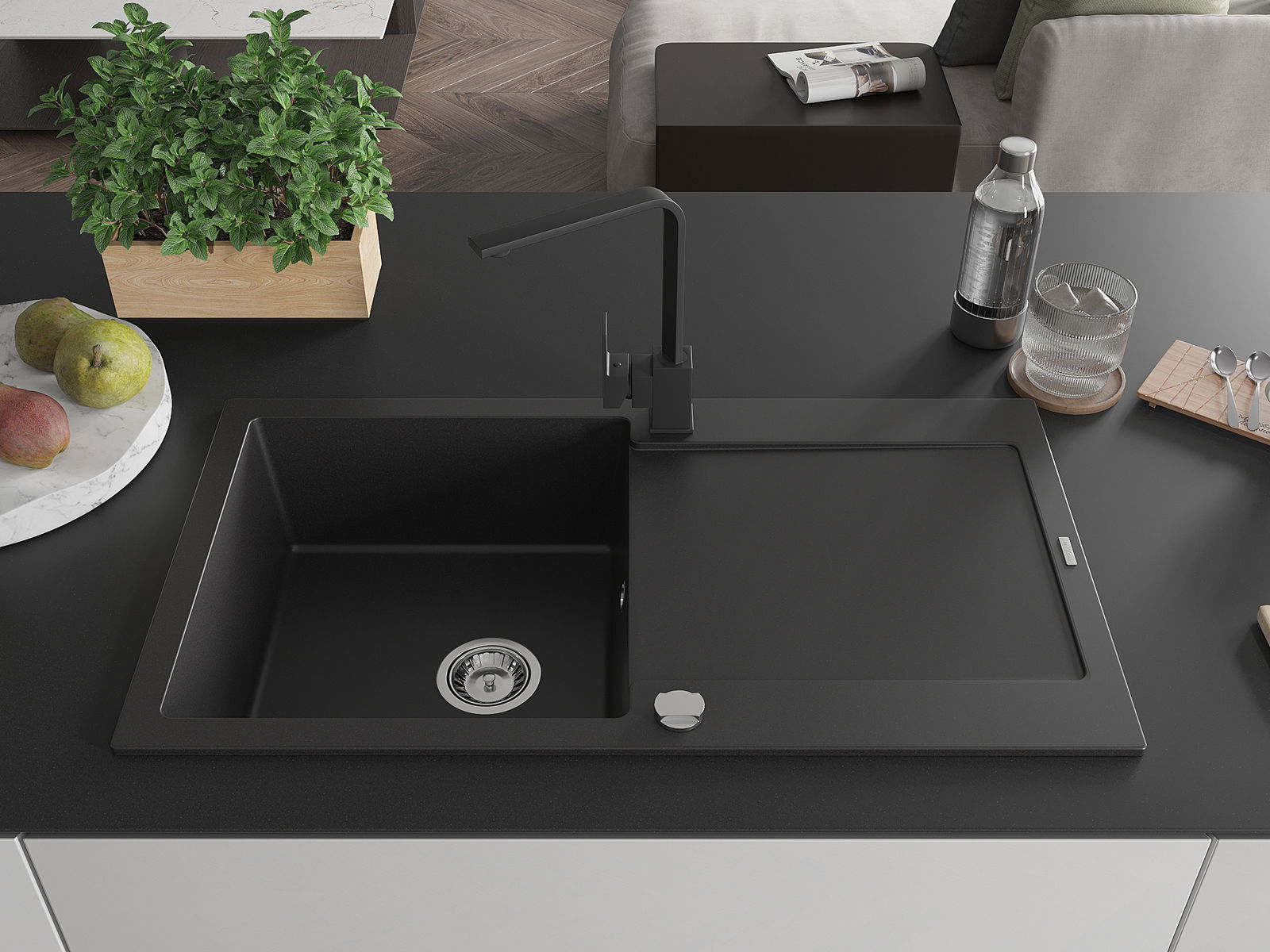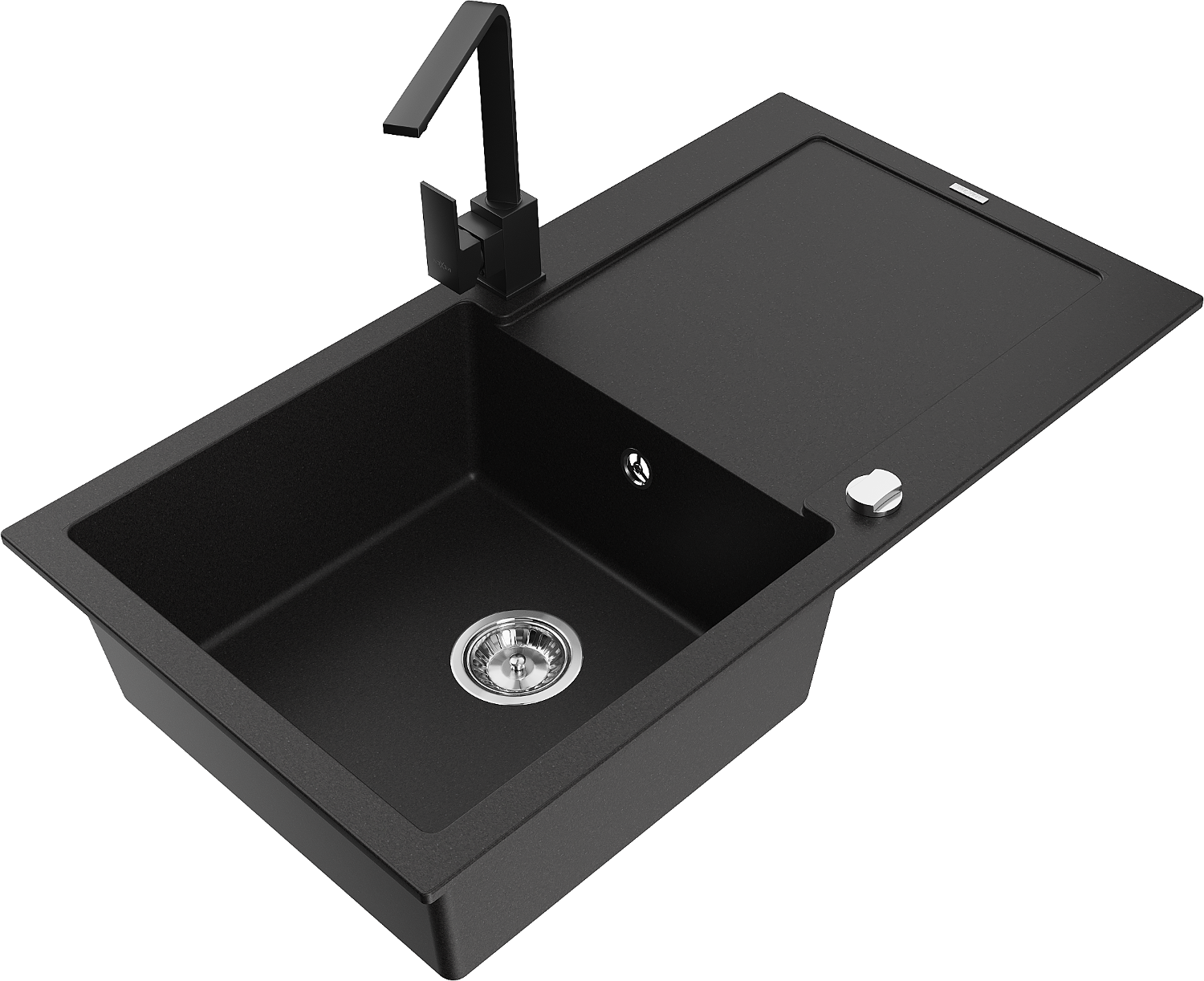 Mexen Leo granitový kuchynský drez s 1 komorou, odkvapkávačom a kuchynskou batériou Rita, čierny - 6501-77-670300-70