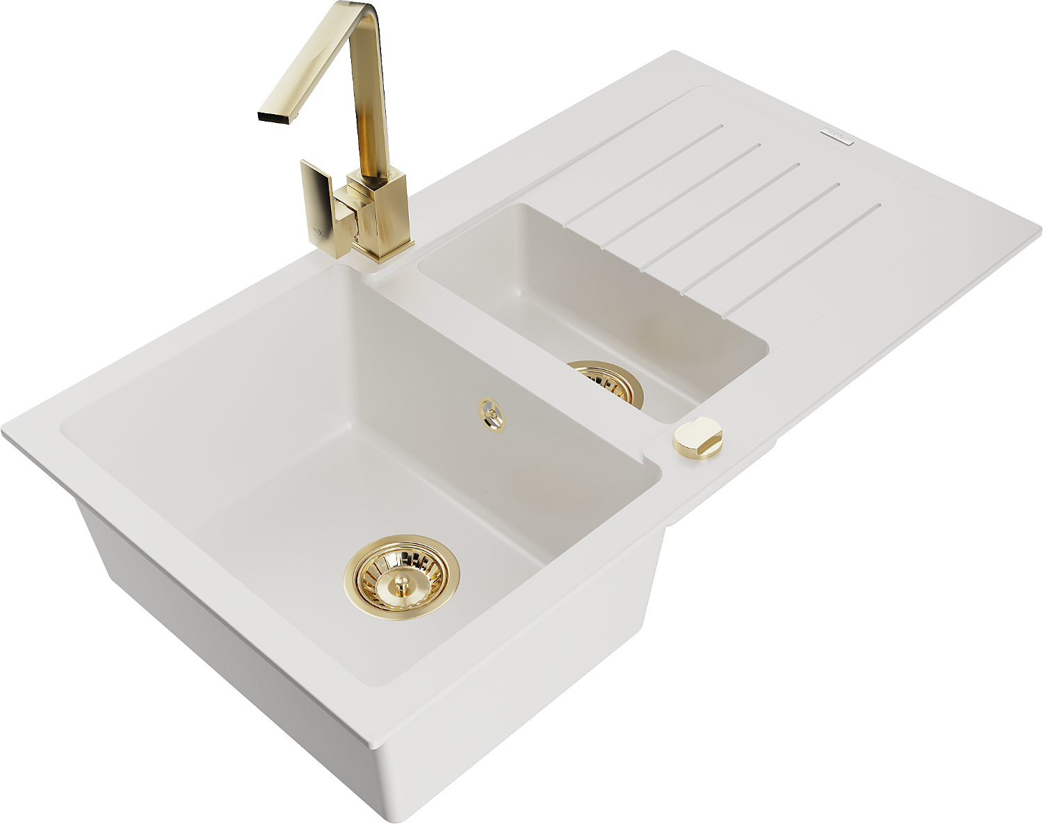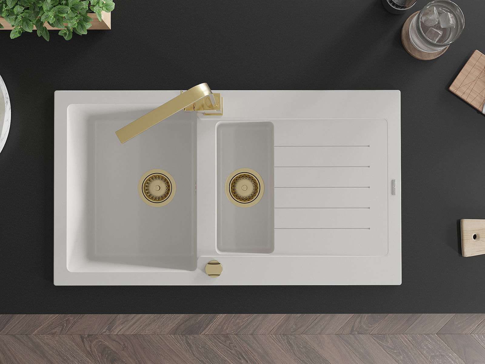 Mexen Matias žulový drez 1,5 komorový s odkvapkávačom a kuchynskou batériou Rita, biely - 6502-20-670300-50