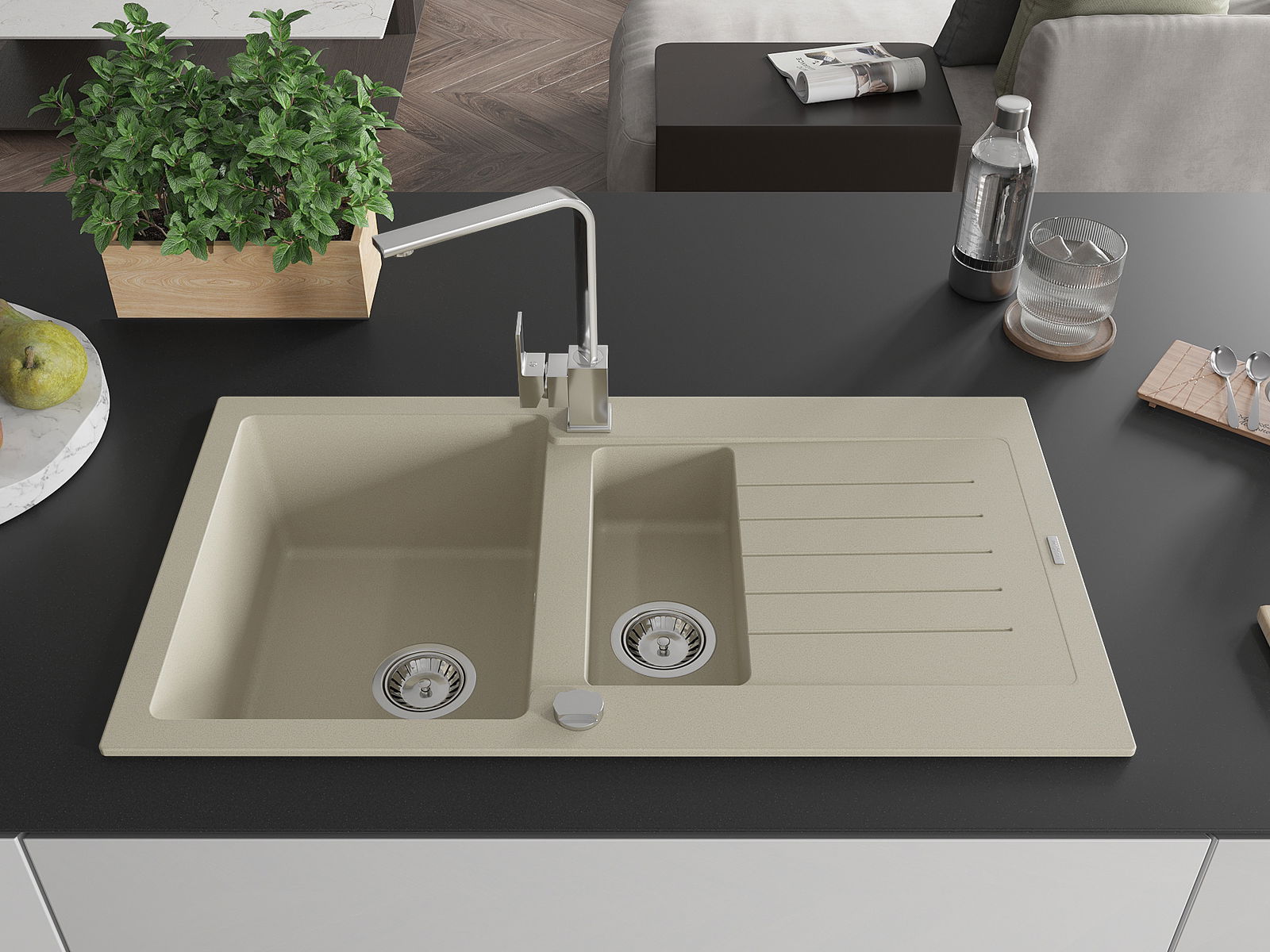 Mexen Matias žulový kuchynský drez 1,5-komorový s odkvapkávačom a kuchynskou batériou Rita, béžový - 6502-69-670300-00