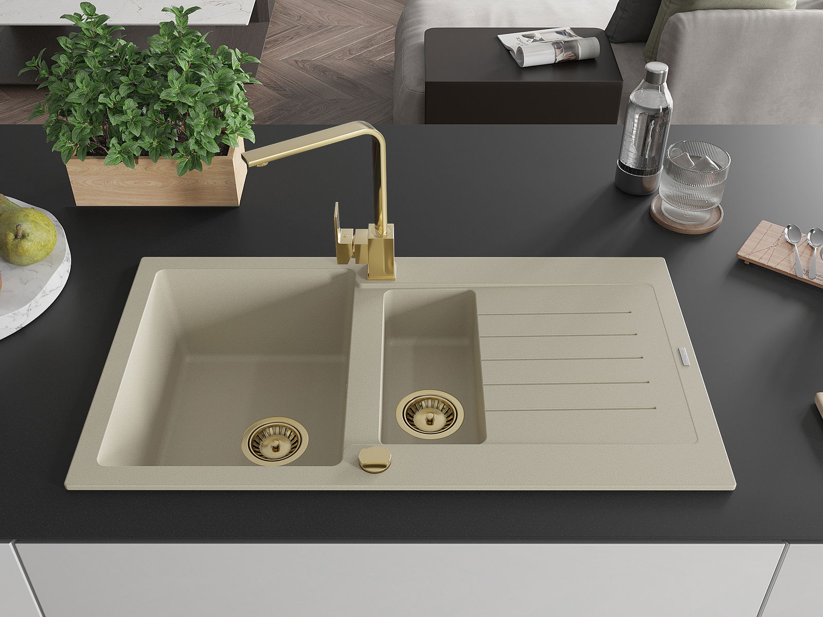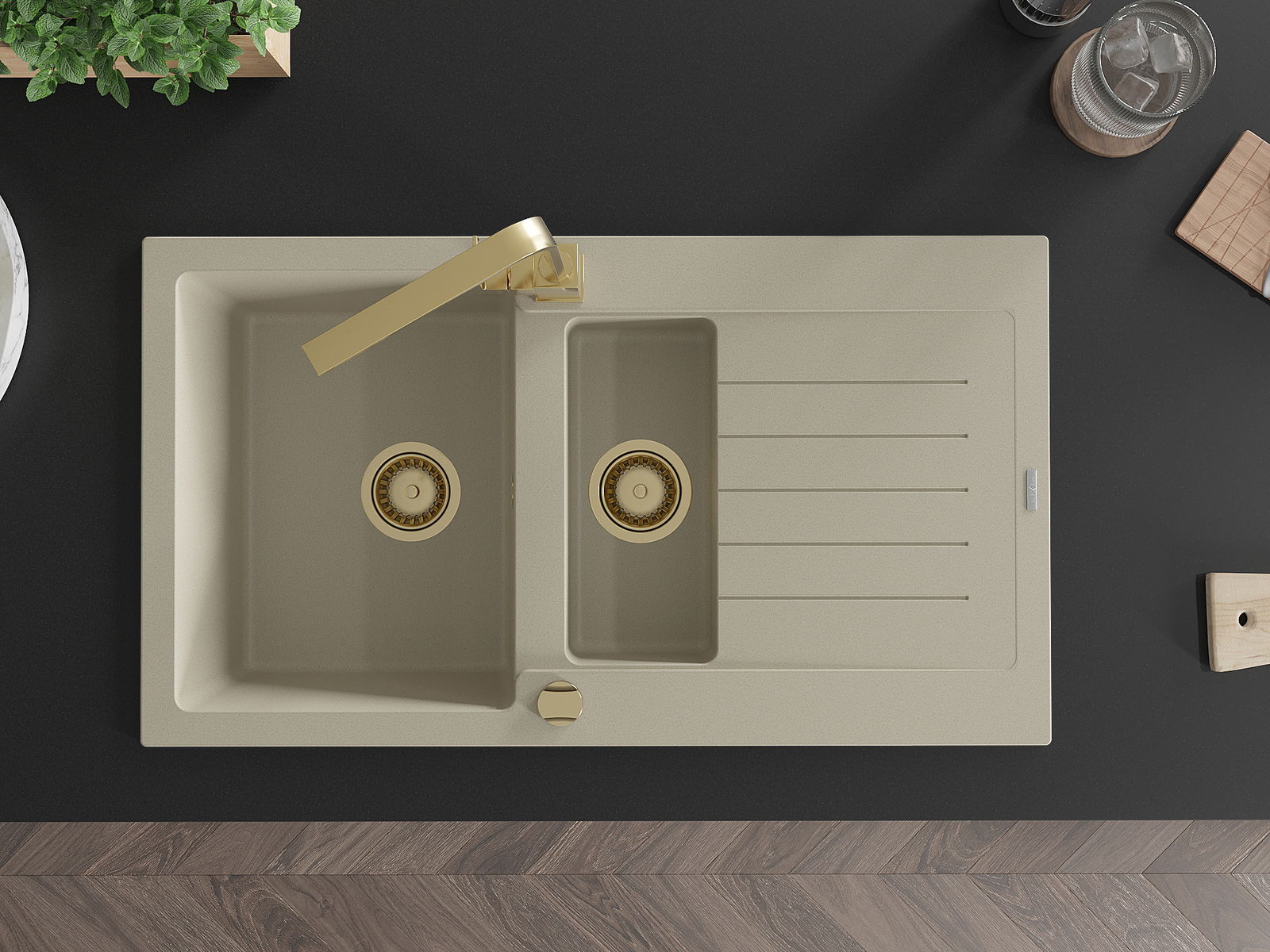 Mexen Matias žulový drez 1,5-komorový s odkvapkávačom a kuchynskou batériou Rita, béžový - 6502-69-670300-50