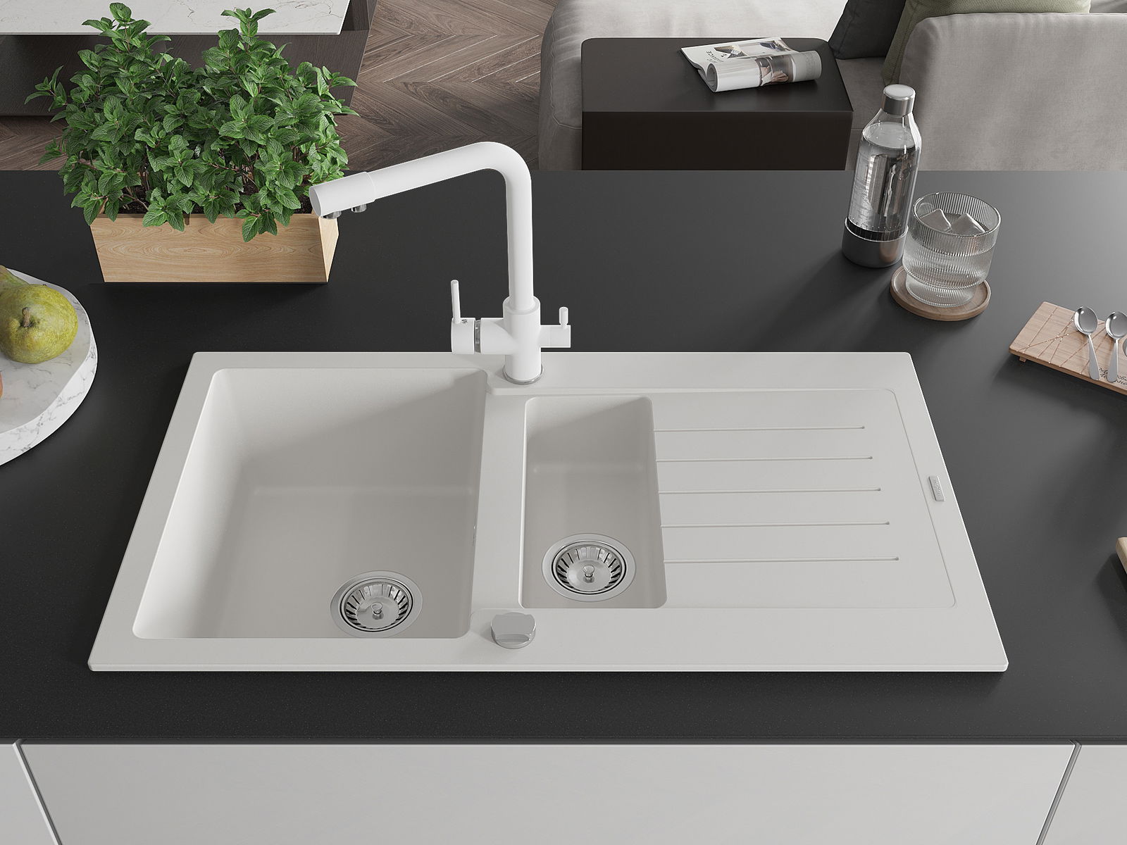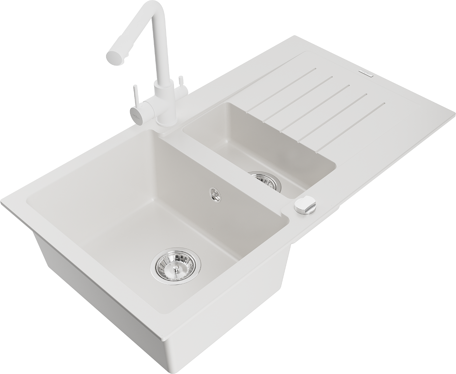 Mexen Matias granitový drez 1,5-komorový s odkvapkávačom a kuchynskou batériou Duero, biely - 6502-20-671600-20