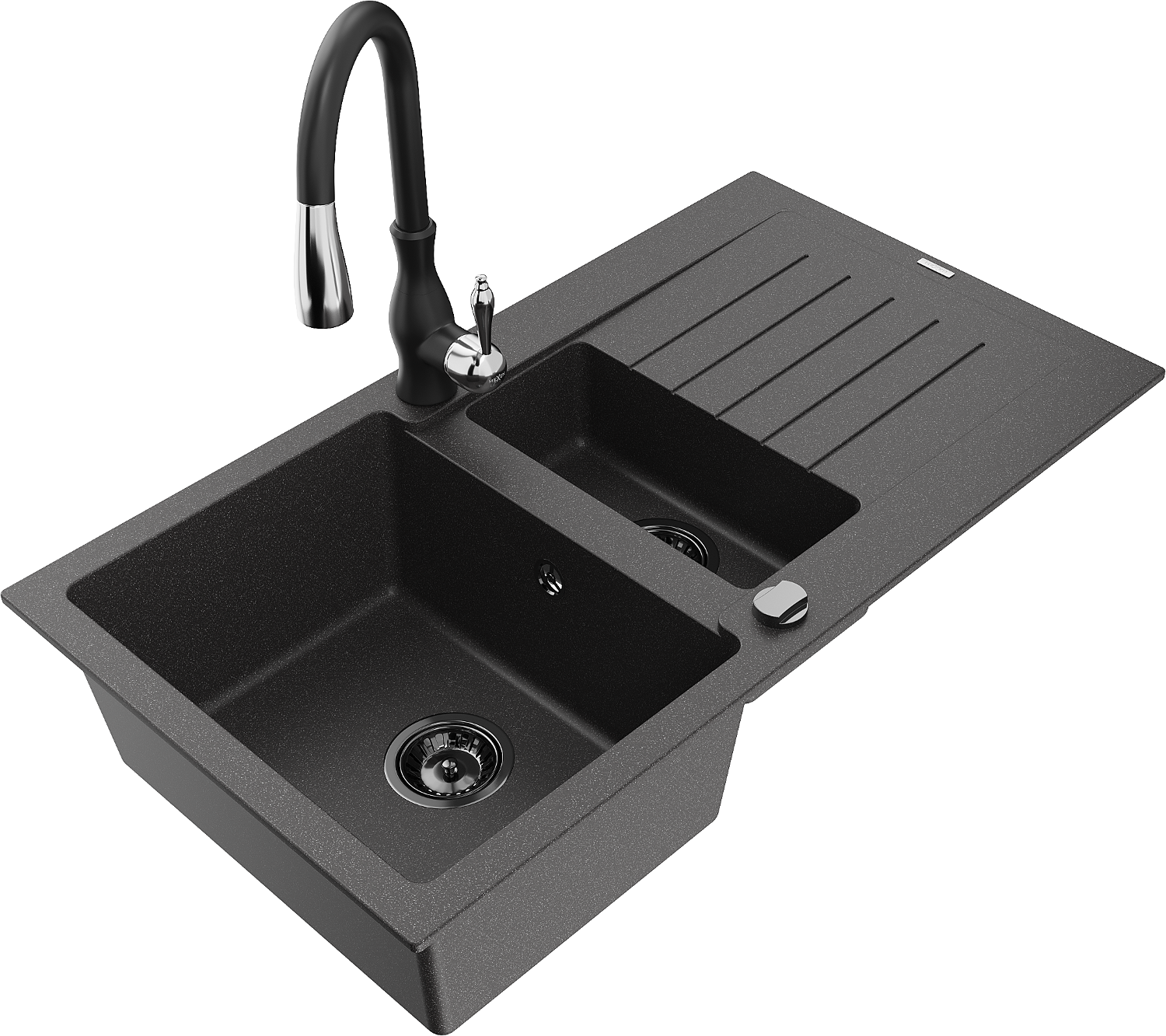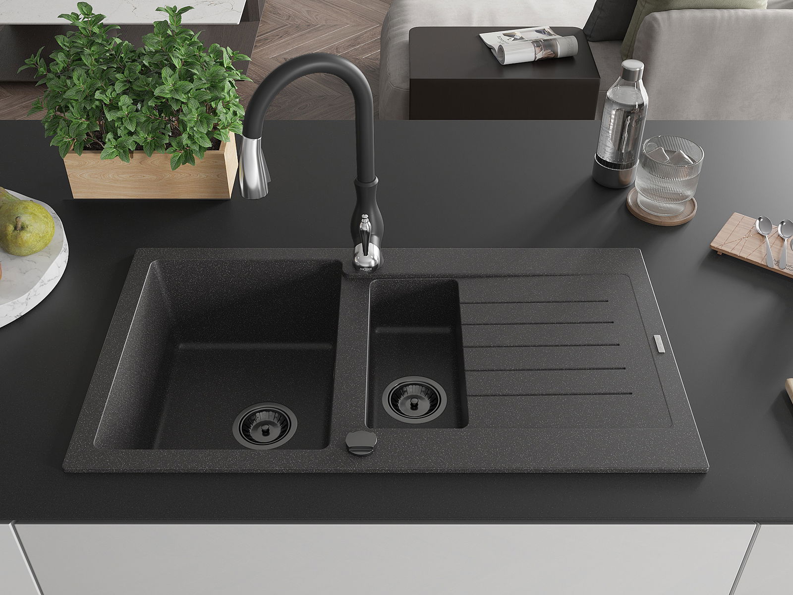 Mexen Matias žulový drez 1,5-komorový s odkvapom a kuchynskou batériou Savita, čierny škvrnitý - 6502-76-672601-70-B