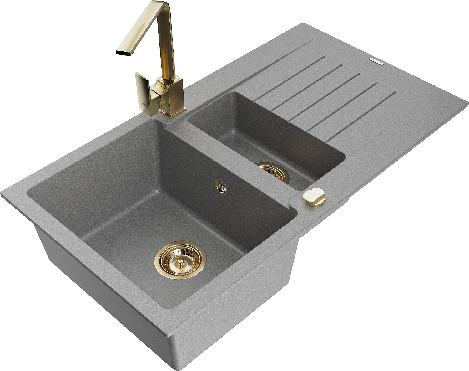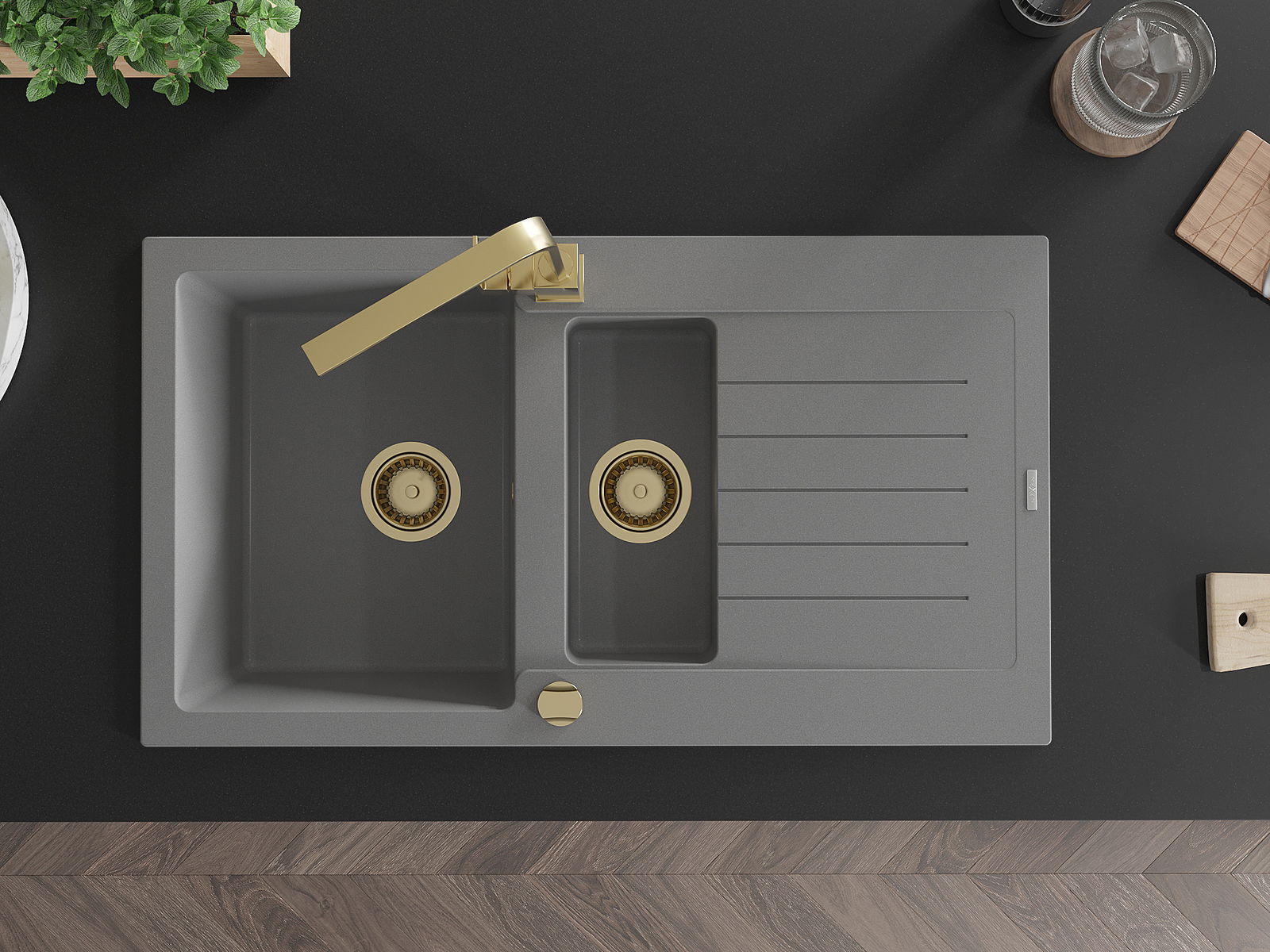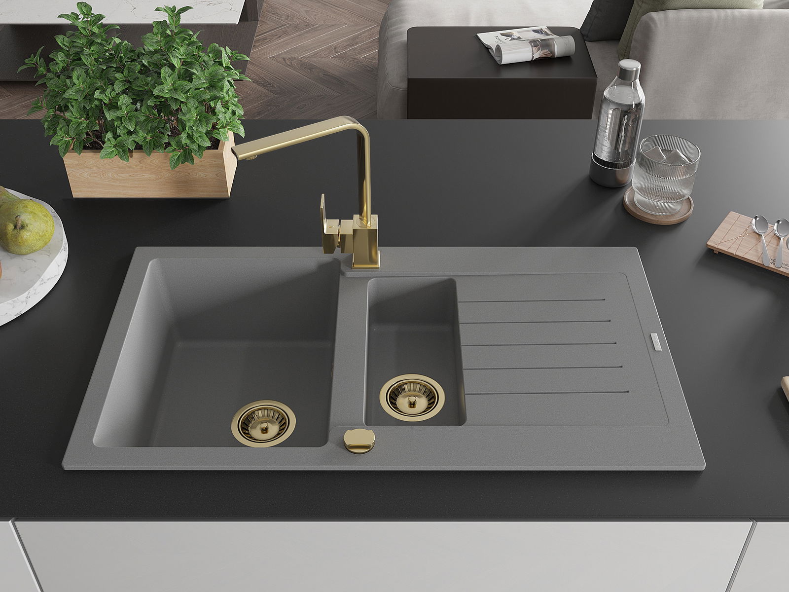 Mexen Matias žulový drez 1,5-komorový s odkvapkávačom a kuchynskou batériou Rita, sivý - 6502-71-670300-50