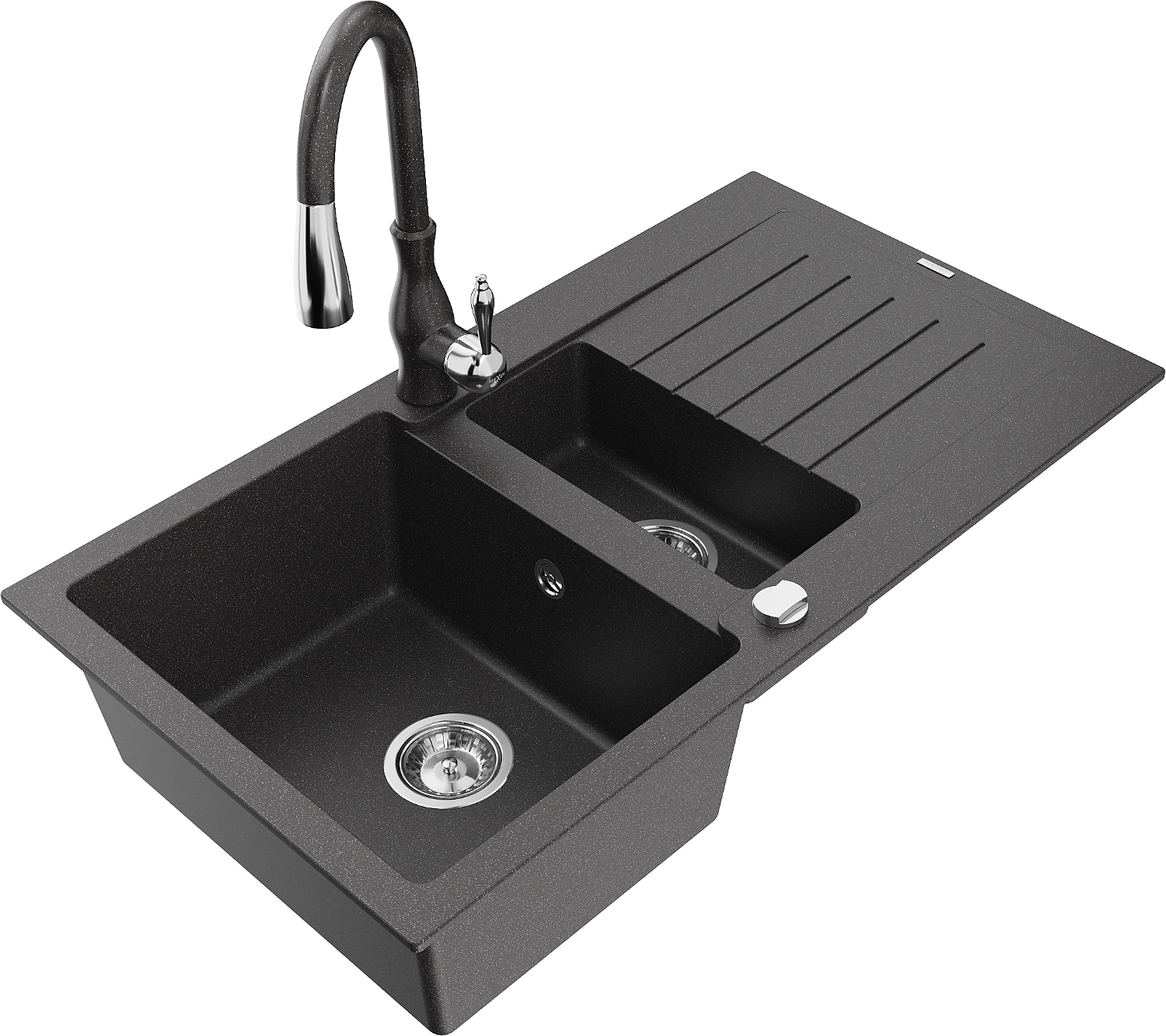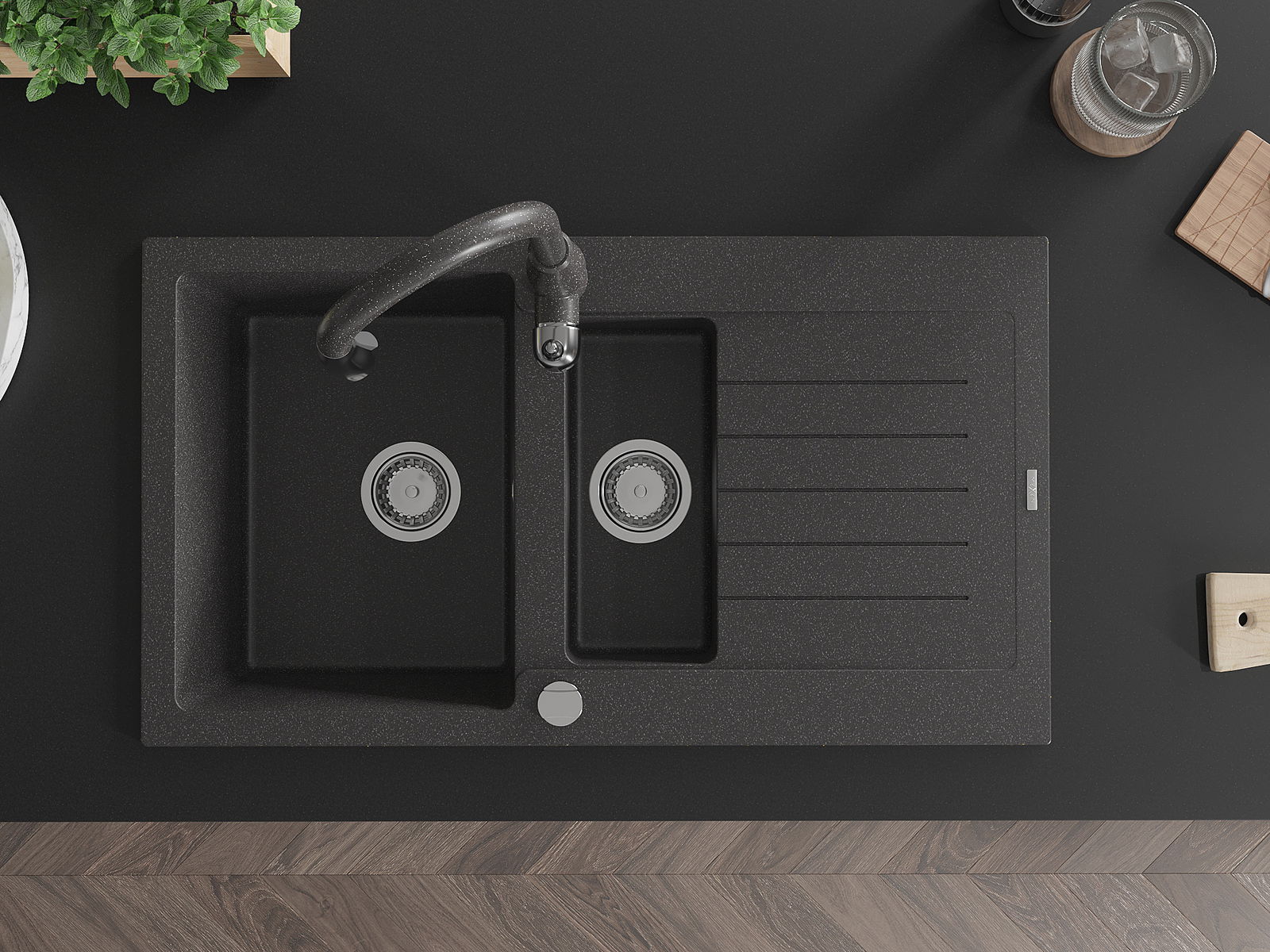 Mexen Matias žulový drez s 1,5 komorou a odkvapkávačom a kuchynskou batériou Savita, čierny s bodkami - 6502-76-672601-76