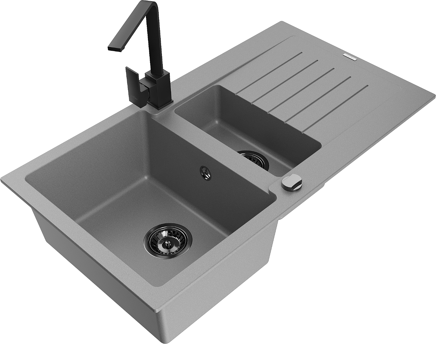 Mexen Matias granitový kuchynský drez 1,5-komorový s odkvapkávačom a kuchynskou batériou Rita, sivý - 6502-71-670300-70-B