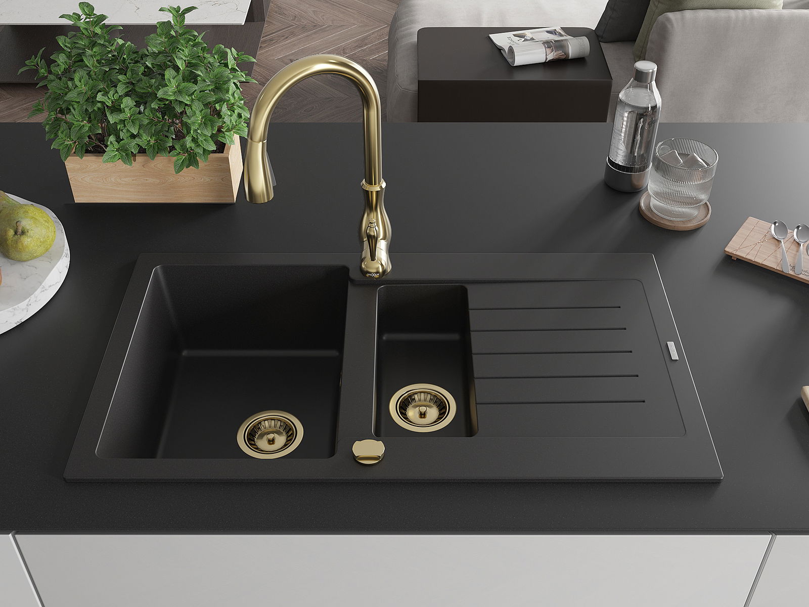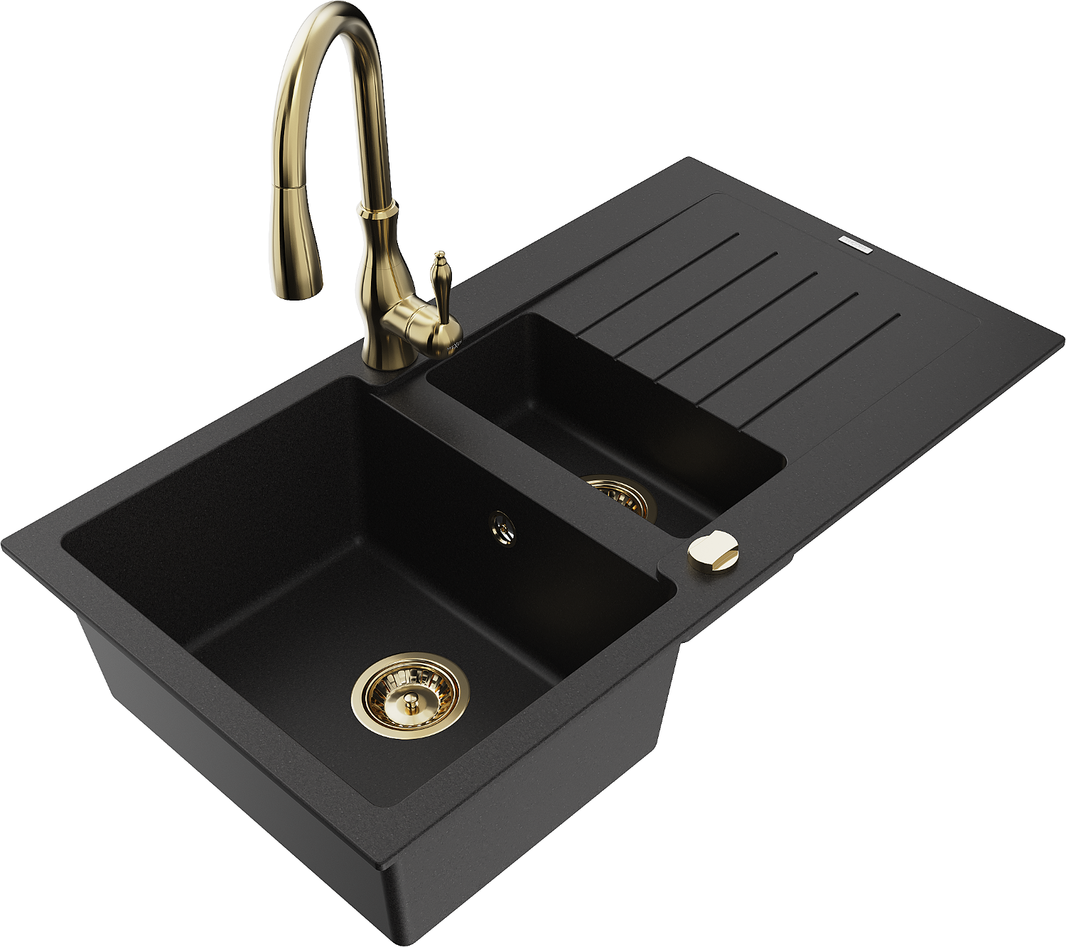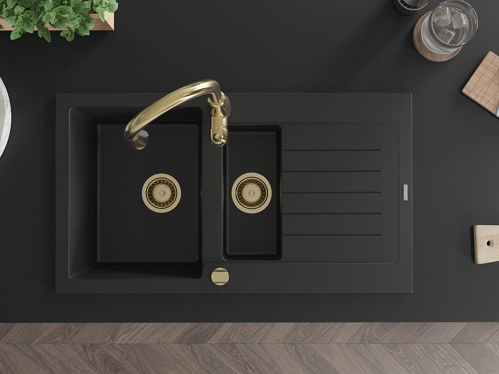 Mexen Matias žulový drez 1,5-komorový s odkvapkávačom a kuchynskou batériou Savita, čierny - 6502-77-672601-50