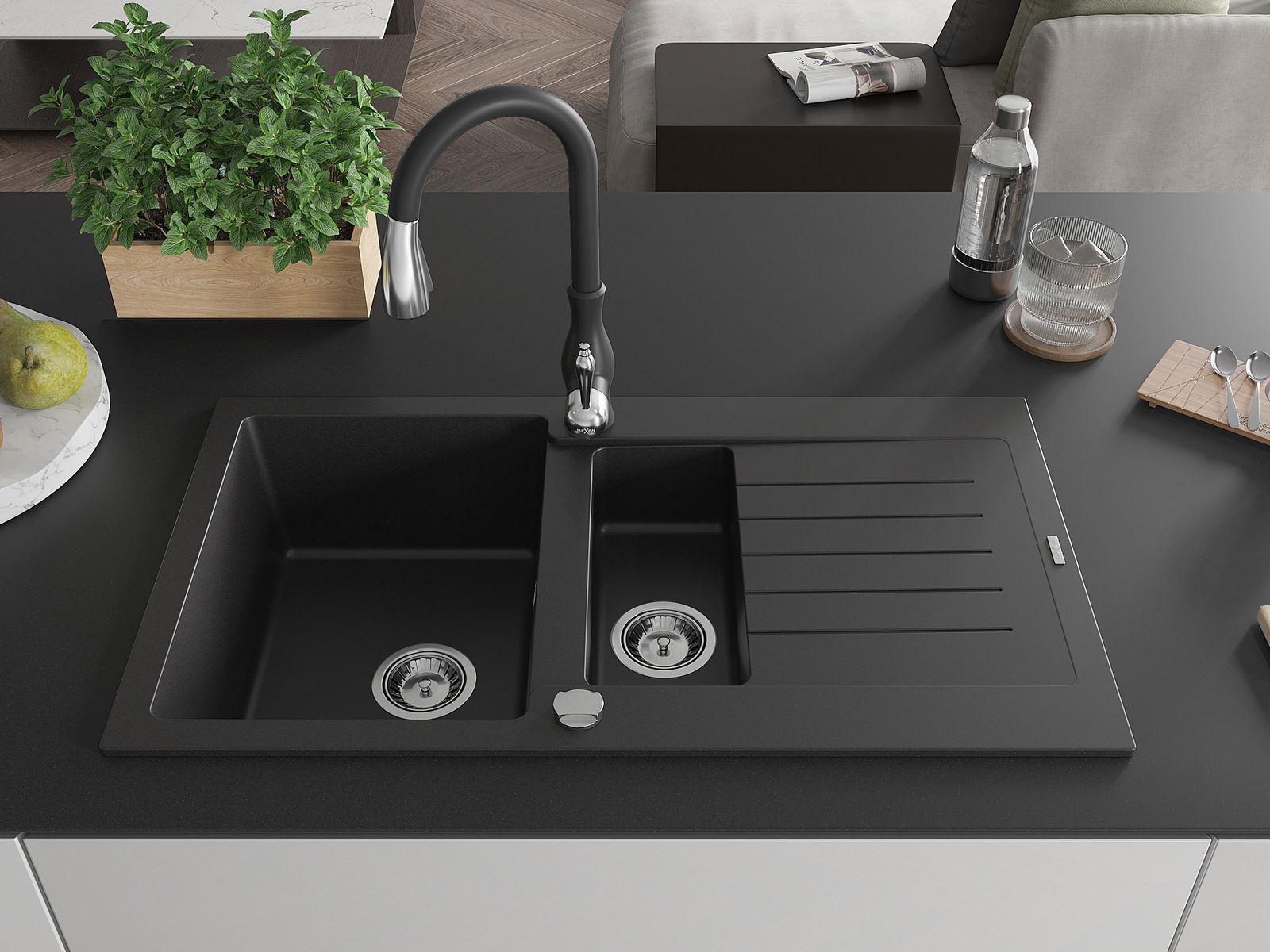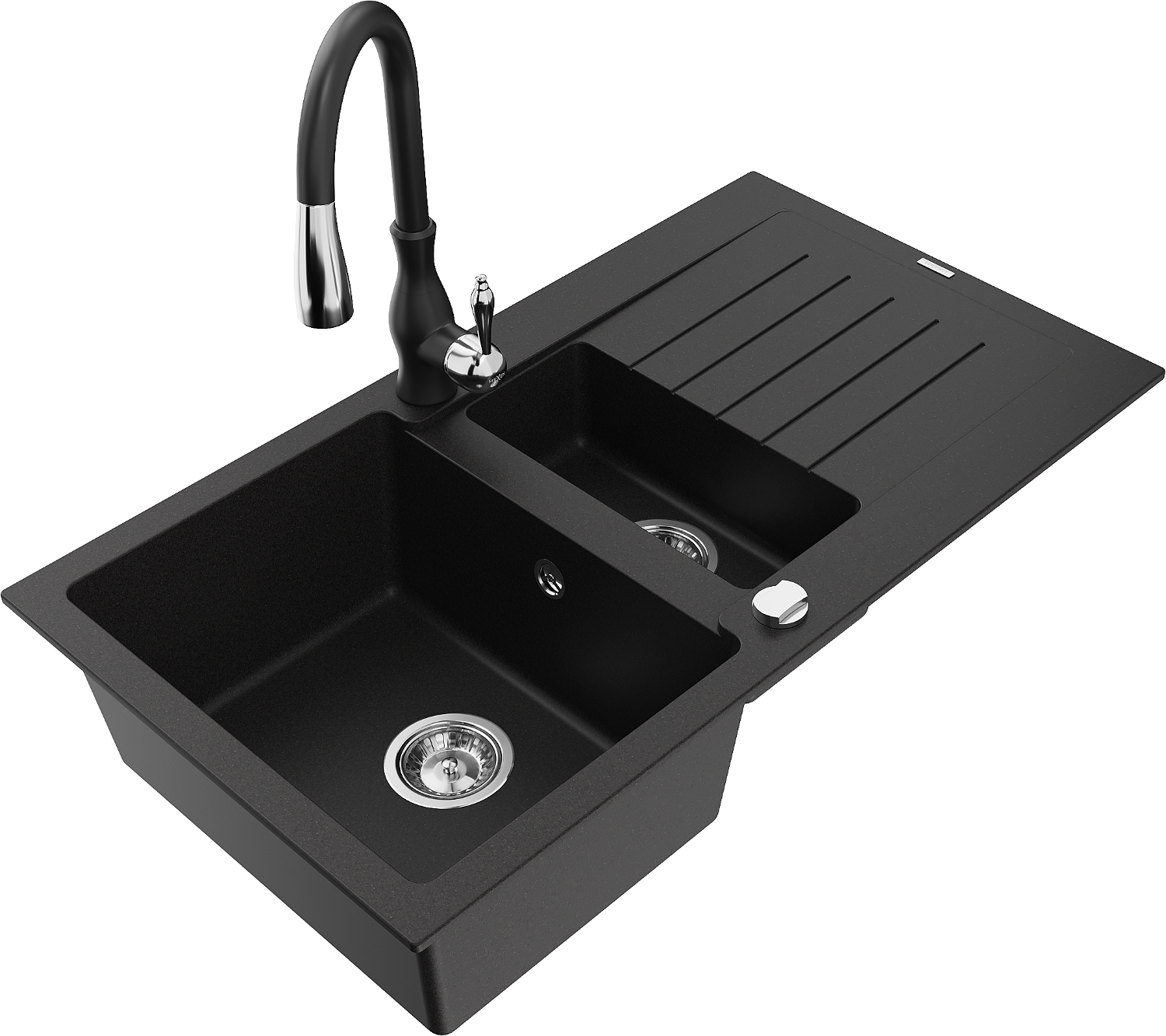 Mexen Matias žulový drez 1,5-komorový s odkvapkávačom a kuchynskou batériou Savita, čierny - 6502-77-672601-70
