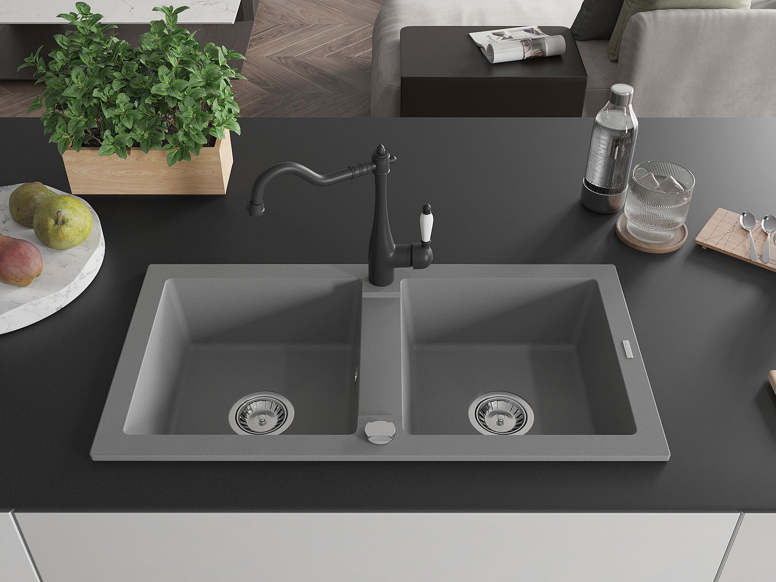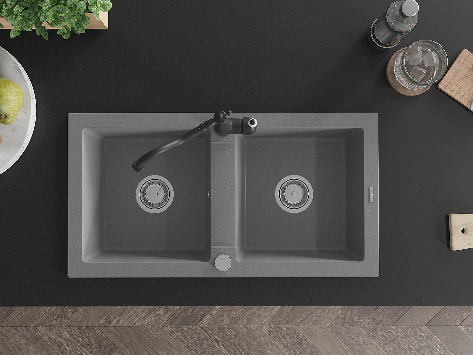Mexen Mario žulový drez s 2 komorami s kuchynskou batériou Carla, sivý - 6504-71-670700-70