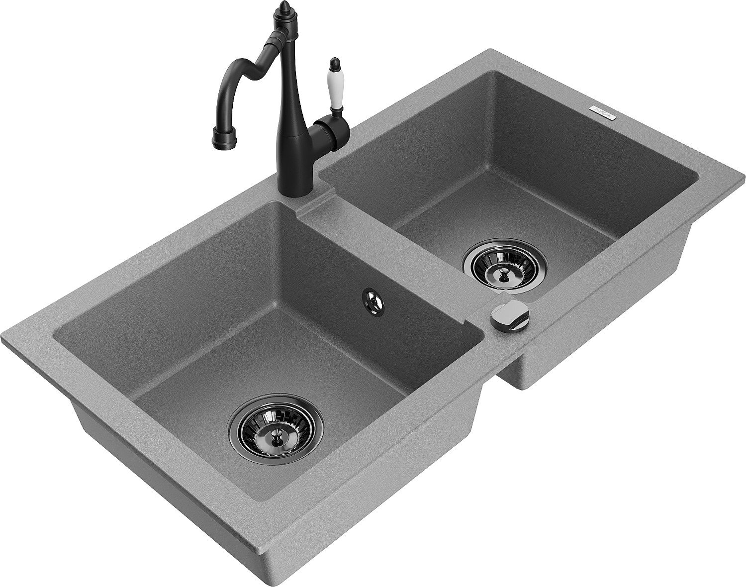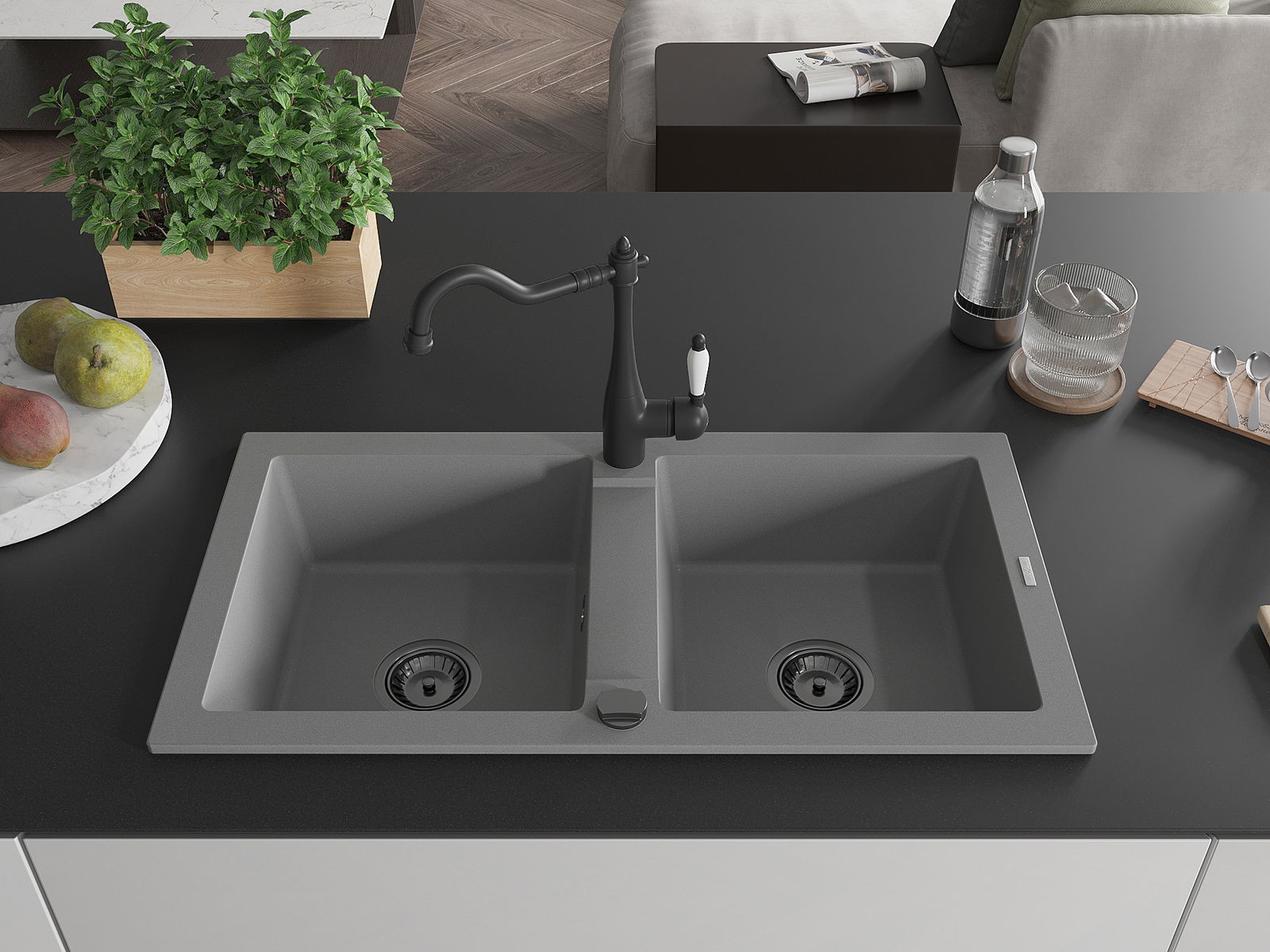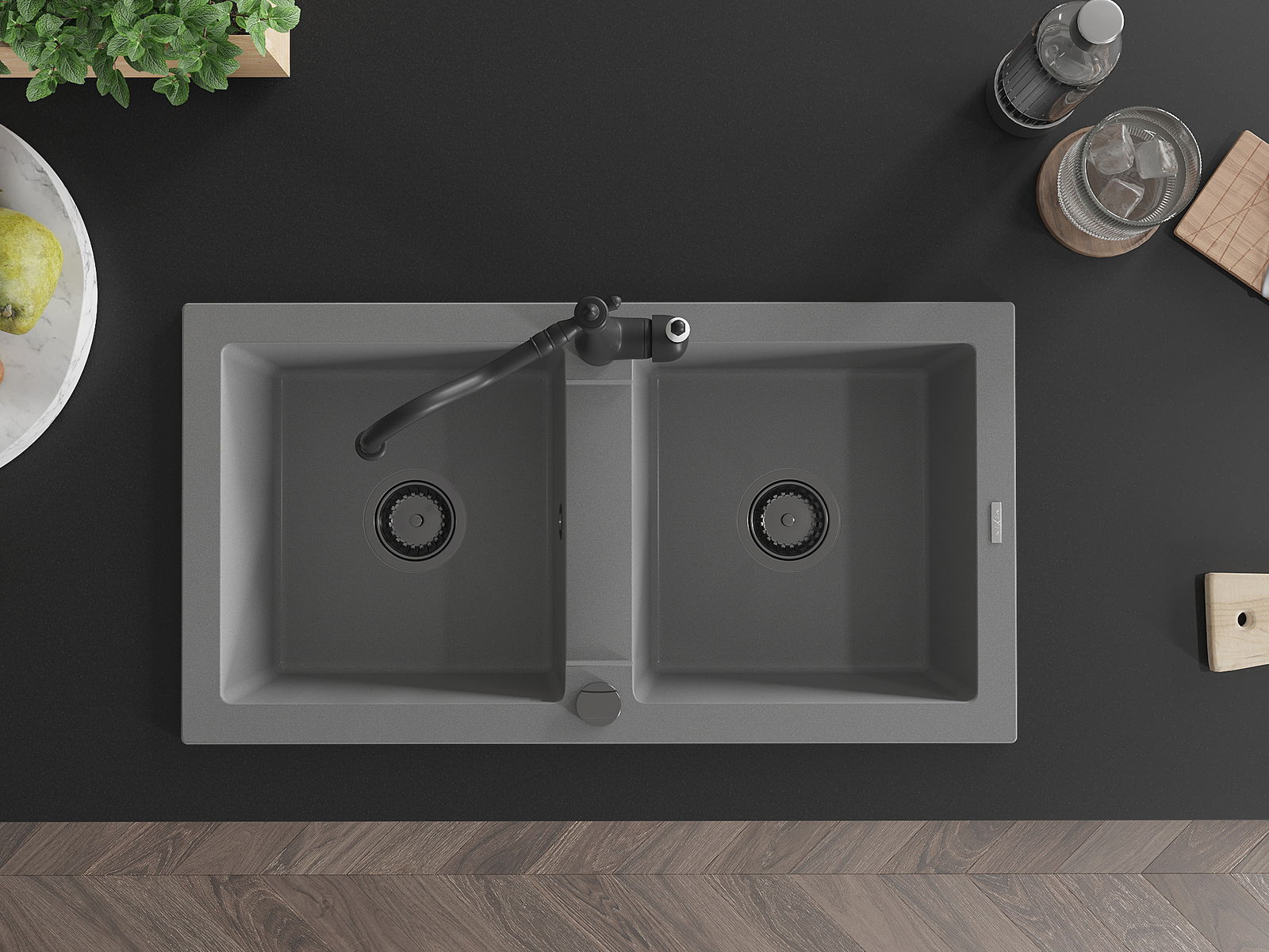 Mexen Mario dvojkomorový žulový kuchynský drez s kuchynskou batériou Carla, sivý - 6504-71-670700-70-B