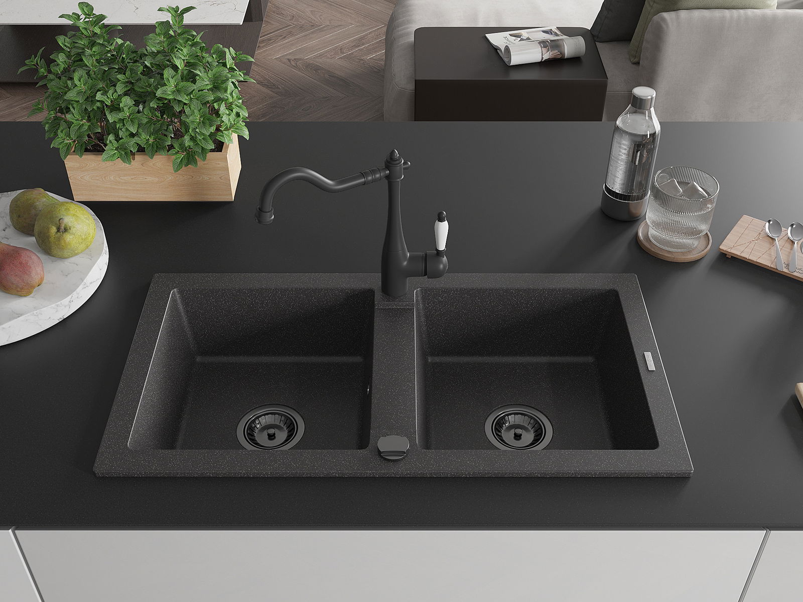 Mexen Mario dvojkomorový žulový drez s kuchynskou batériou Carla, čierny bodkovaný - 6504-76-670700-70-B