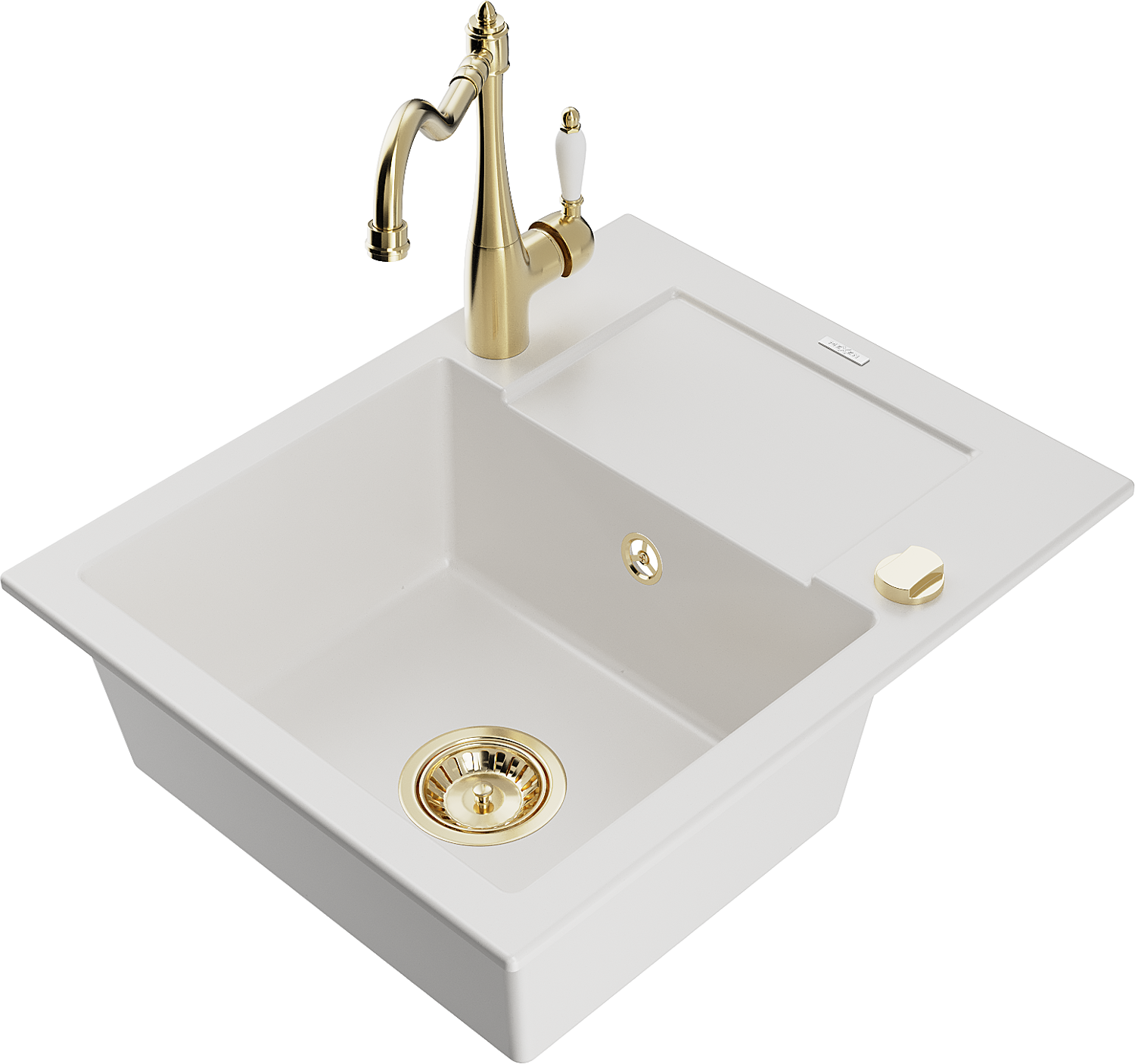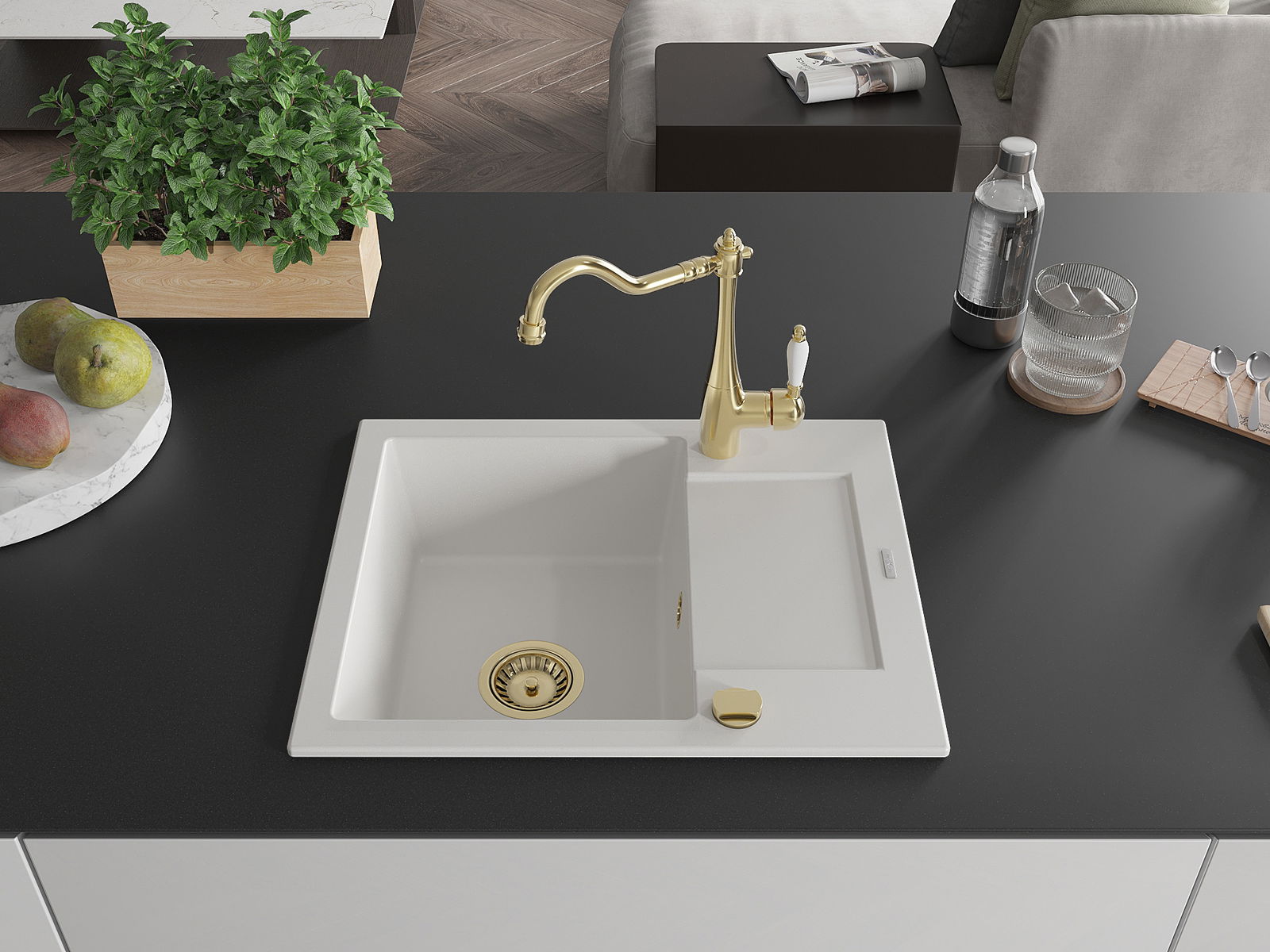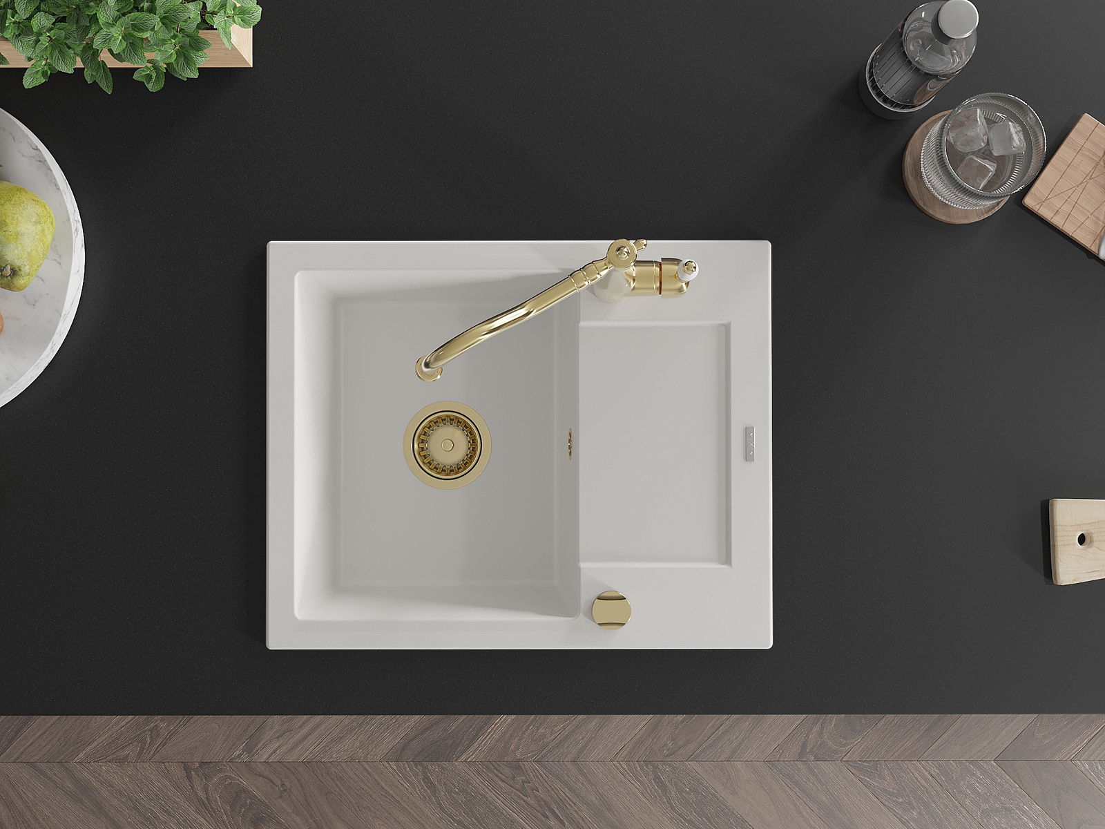 Mexen Enzo granitový kuchynský drez s 1 komorou, odkvapkávačom a kuchynskou batériou Carla, biely - 6506-20-670700-50