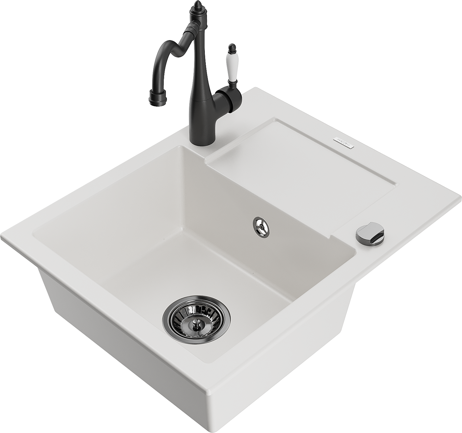 Mexen Enzo kamenný kuchynský drez 1-komorový s odkvapkávacou plochou a kuchynskou batériou Carla, biely - 6506-20-670700-70