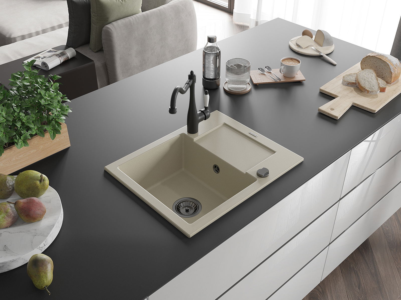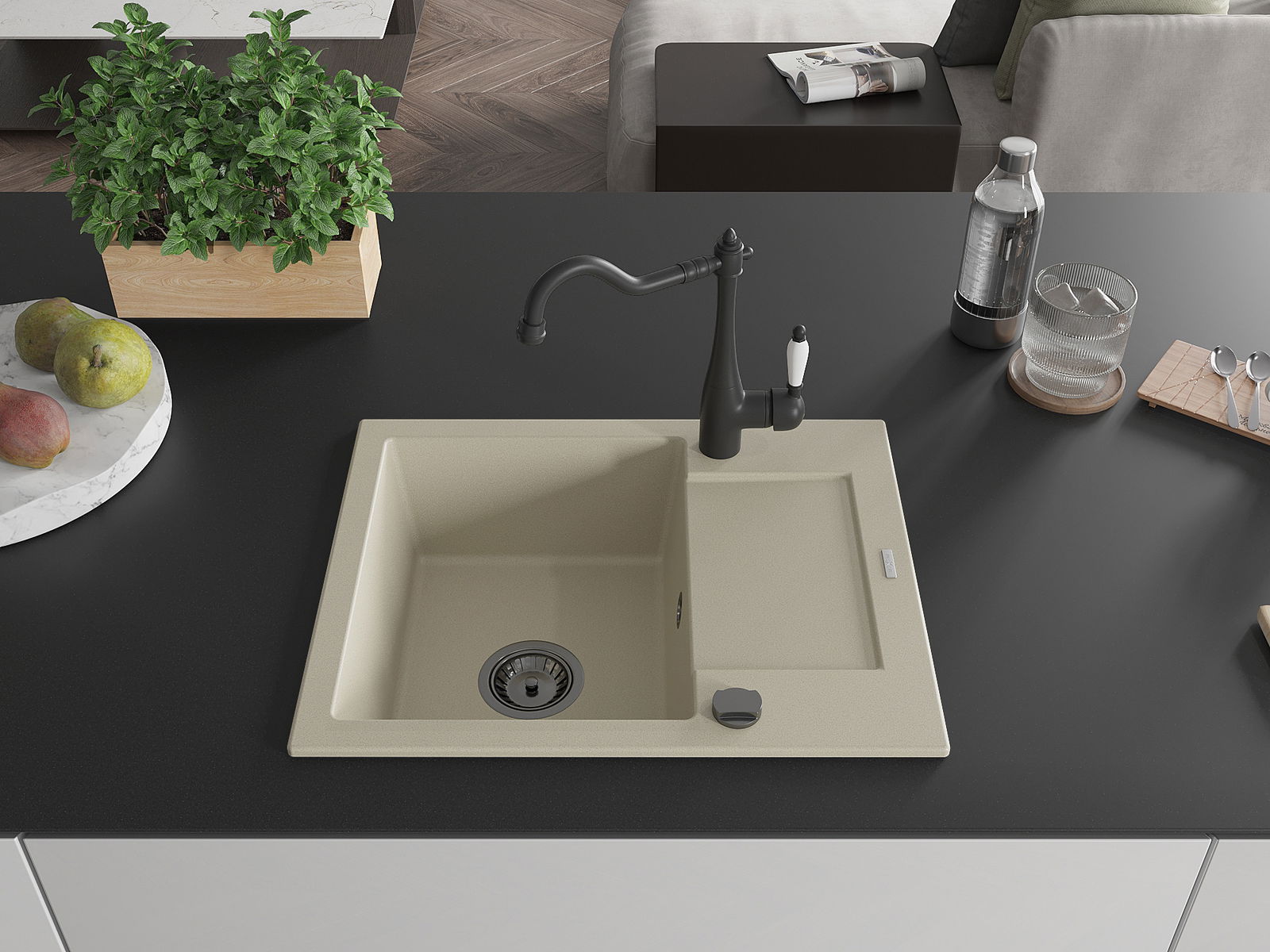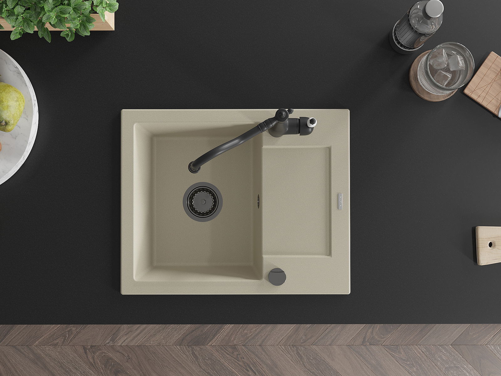 Povrch umývadla je odolný voči škvrnám a sfarbeniu, vďaka čomu sa ľahko čistí a zachováva si svoju farbu po dlhú dobu. Estetický a prakticky dopĺňajúci každú kuchyňu.