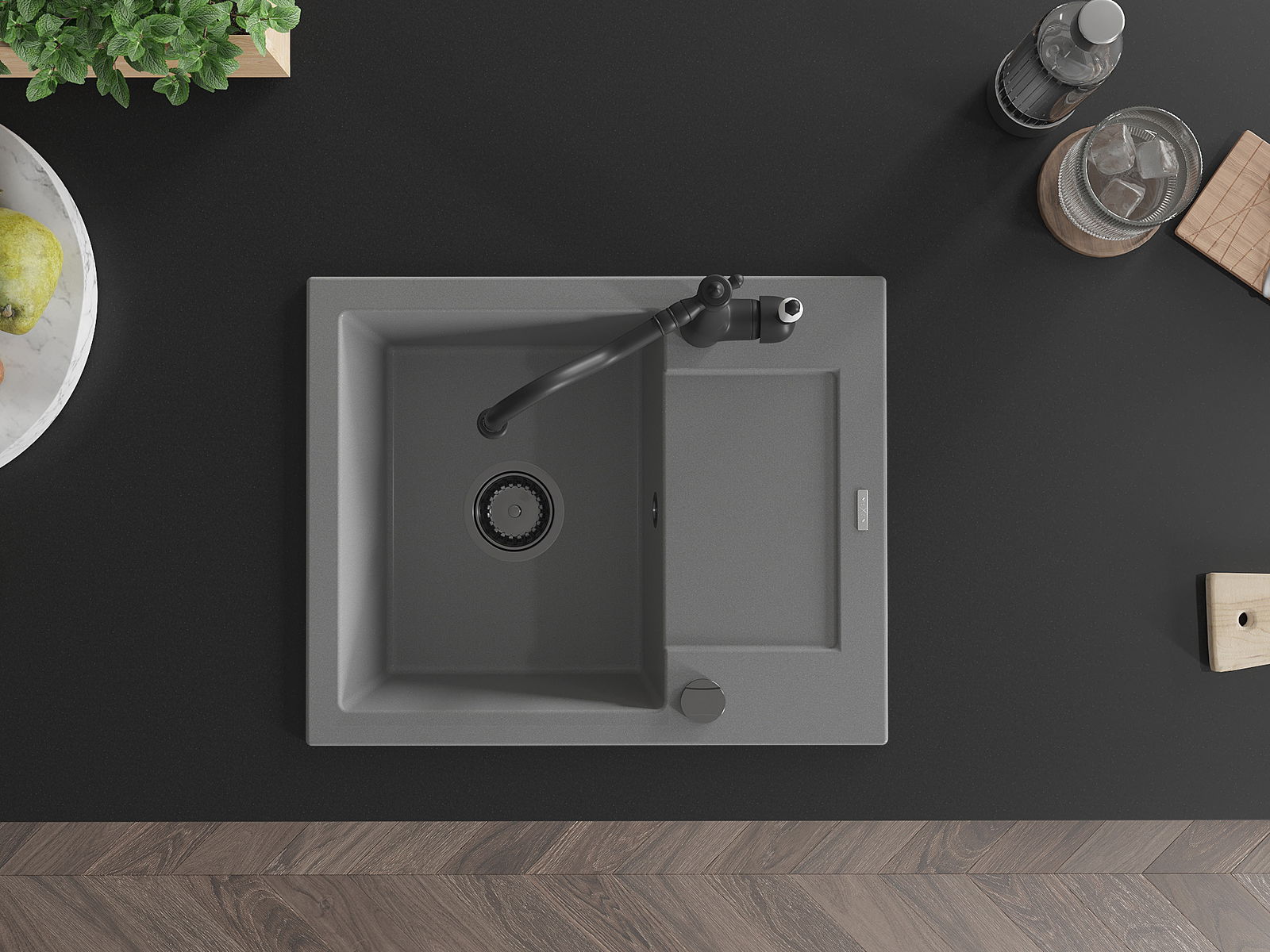 Mexen Enzo jednovaničkový granitový drez s odkvapkávačom a kuchynskou batériou Carla, sivý - 6506-71-670700-70-B