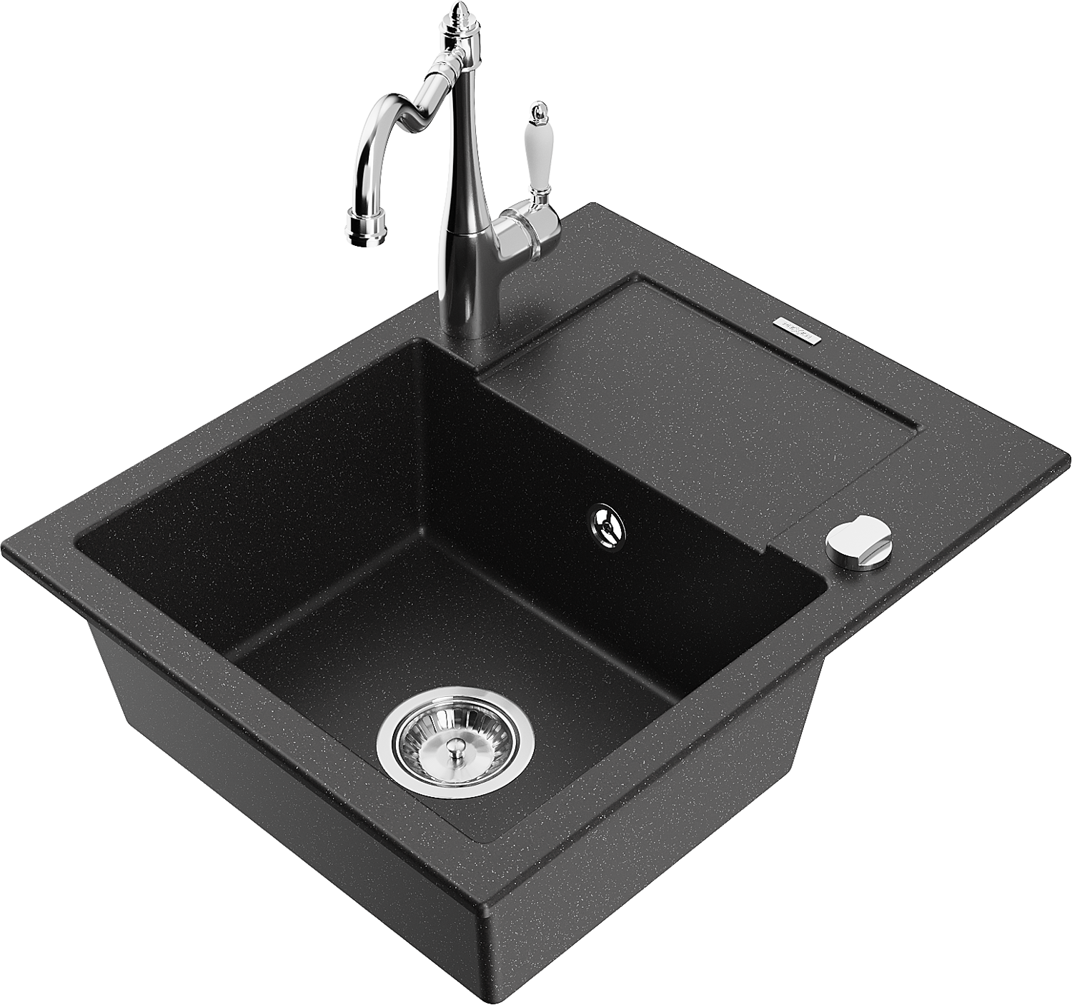 Mexen Enzo žulový drez 1-komorový s odkvapkávačom a kuchynskou batériou Carla, čierno/strieborný metalik - 6506-73-670700-00