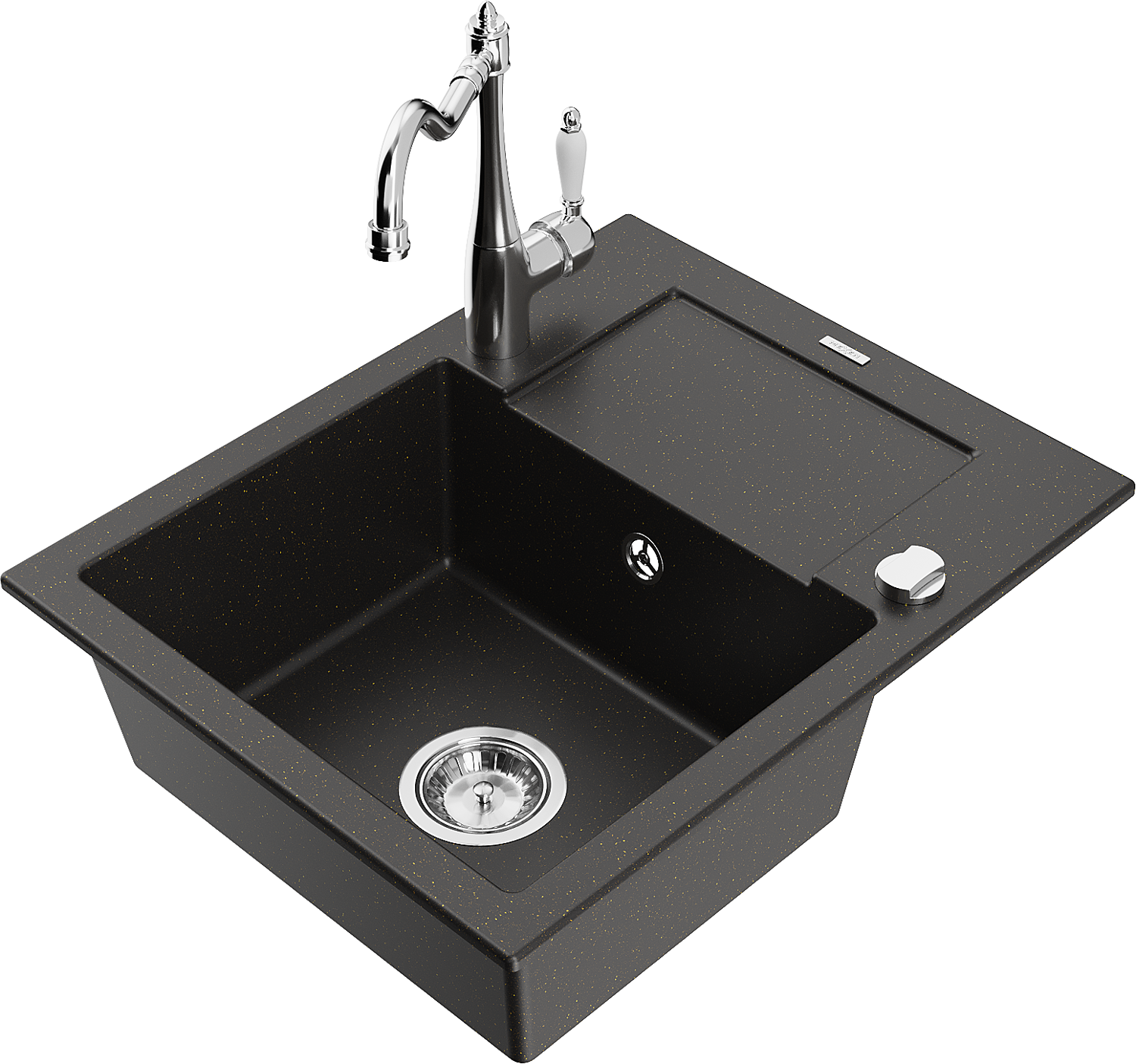 Mexen Enzo granitový drez s 1-komorou a odkvapkávačom a kuchynskou batériou Carla, čierny/zlatý metalik - 6506-75-670700-00