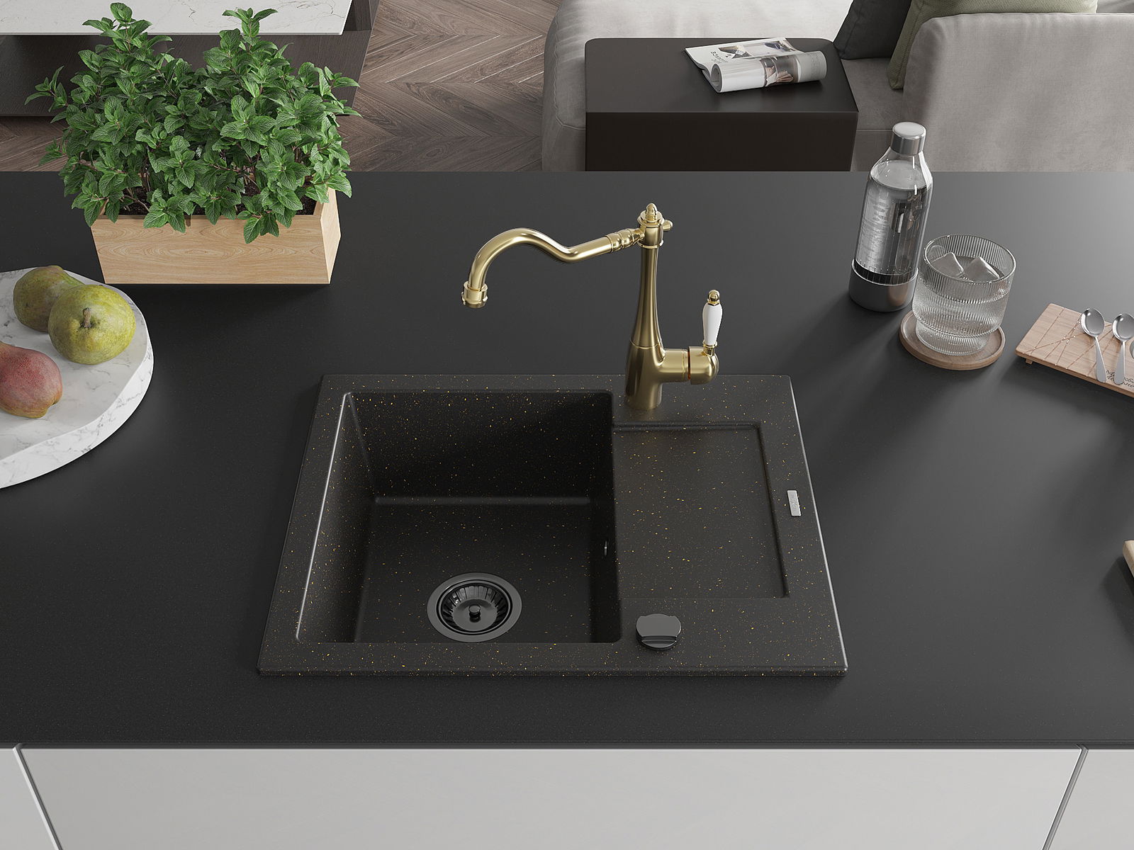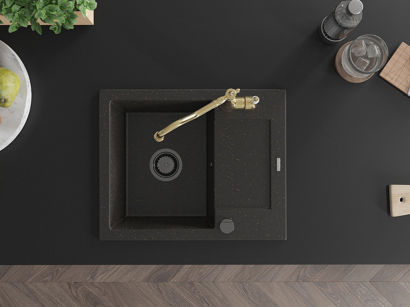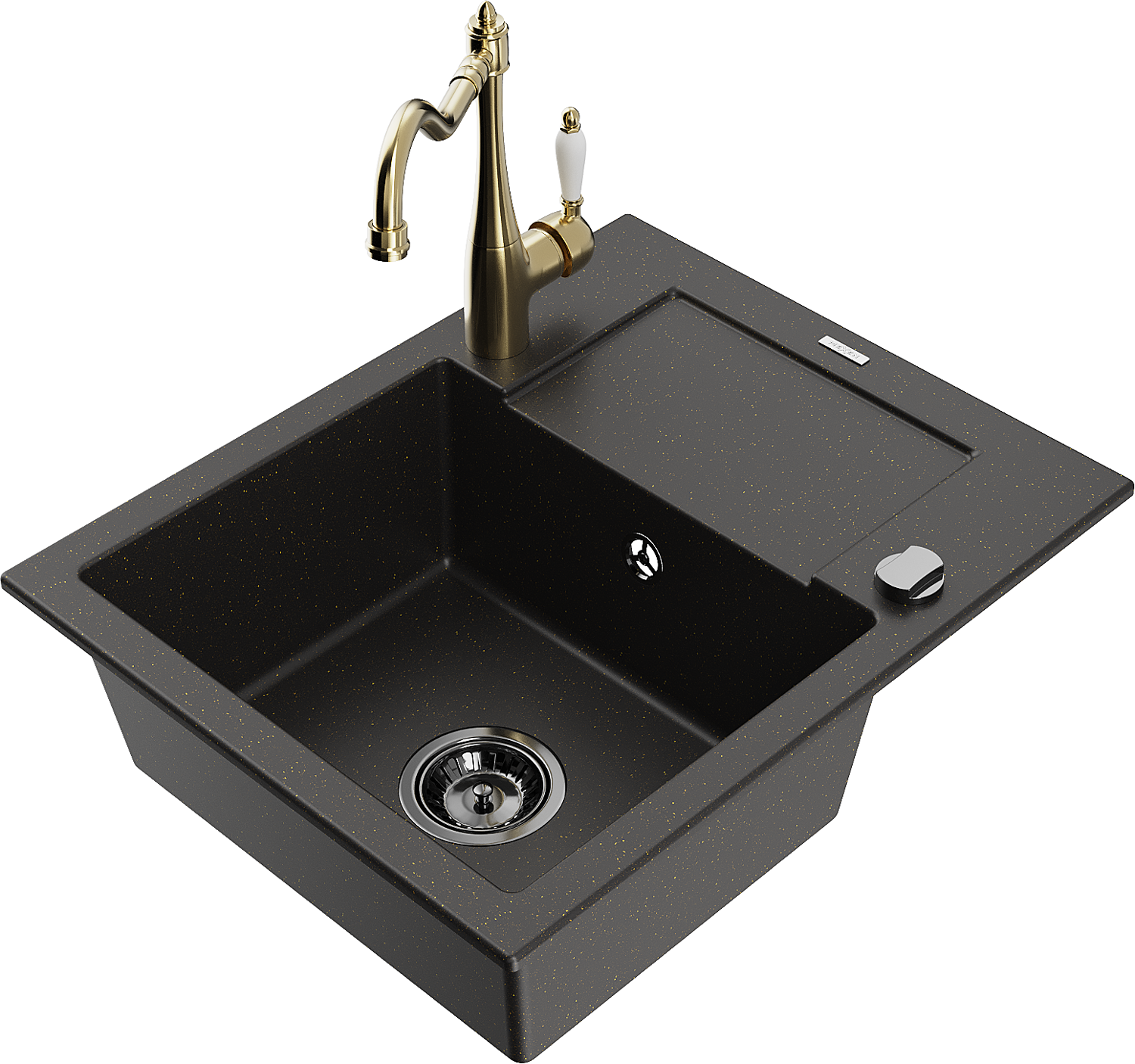 Mexen Enzo granitový drez 1-komorový s odkvapkávačom a kuchynskou batériou Carla, čierno/zlatý metalik - 6506-75-670700-50-B