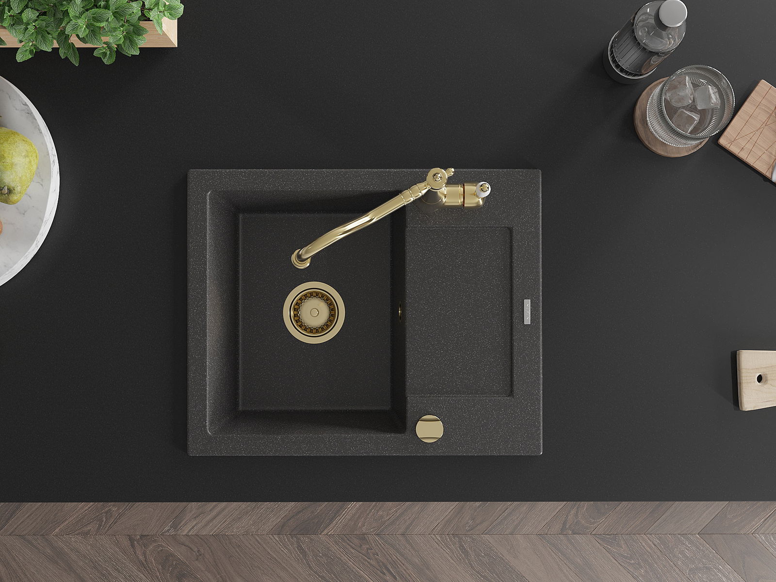 Mexen Enzo granitový drez 1-komorový s odkvapkávačom a kuchynskou batériou Carla, čierny strakatý - 6506-76-670700-50