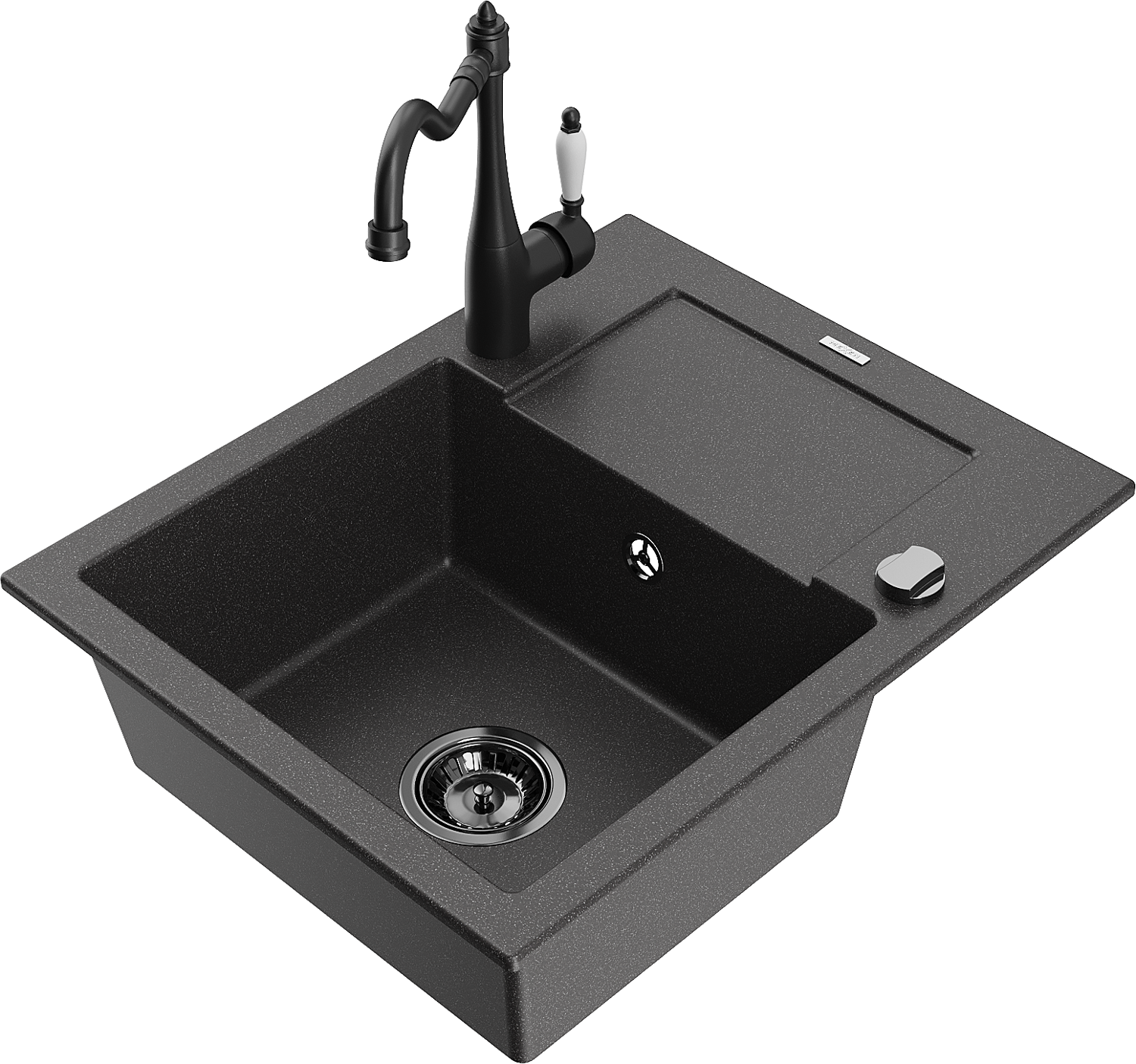 Mexen Enzo granitový drez s 1 komorou, odkvapkávačom a kuchynskou batériou Carla, čierny s bodkami - 6506-76-670700-70-B