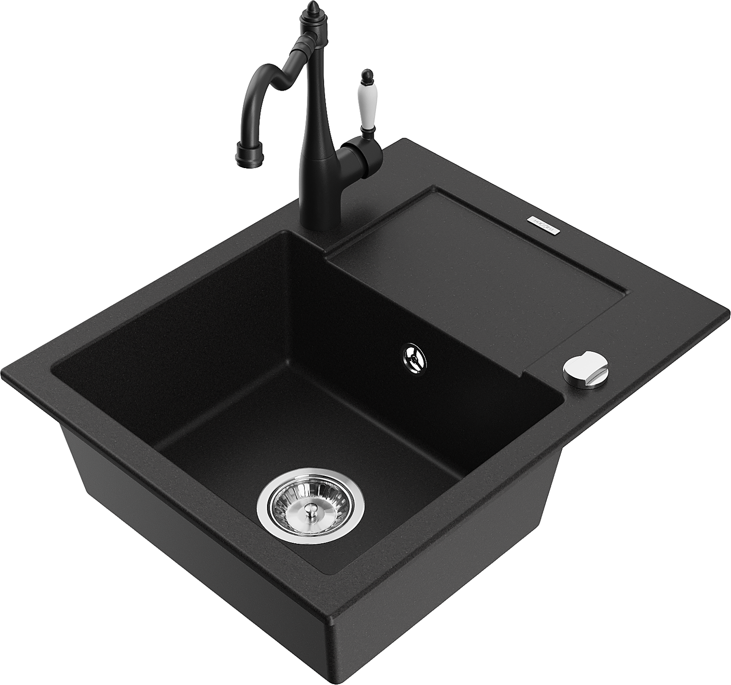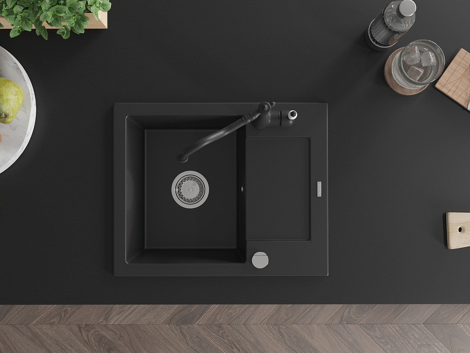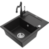 Mexen Enzo jednokomorový granitový drez s odkvapkávačom a kuchynskou batériou Carla, čierny - 6506-77-670700-70